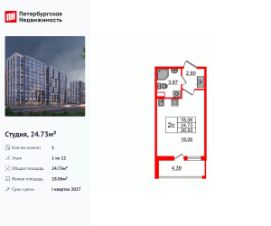 Продается просторная студия от застройщика в жилом комплексе ''Бионика Заповедная'' в динамичном Приморском районе.До метро можно добраться на транспорте всего за 11 минут.Удобная, классическая, функциональная европланировка, вместительная прихожая 2.8 м². Общая площадь студии - 24.73 м², жилая 18.06 м², высота потолка 2.77 м.Квартира продается с отделкой ''NORD LINE WHITE ВК NEW''.Что особенного в ЖК ''Бионика Заповедная''?• Оазис в городе 3 минуты пешком до Новоорловского заказника (140 ГА)• Захватывающие виды из окон на хвойный лесопарк• Всесезонный ''Заповедный парк'' во дворе площадью 23000 кв.м.• 5 единых входных групп с авторским дизайном и лаундж-зонами, сити-виллы на первых этажах с палисадниками и высотой потолков до 4 м• Места притяжения: фонтан ''Бионика'', спортивный кластер со скейт-парком, фотозоны с арт-объектами