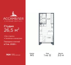 Продается 1-комн. квартира-студия в Клубный квартал ''Ассамблея'' на 1 этаже. Квартира без отделки, новый владелец может сделать ремонт по индивидуальному проекту. Общая площадь: 26.5 кв.м., площадь гостиной 17.51 кв.м., из которых 5 кв.м. выделено под кухонную зону. Все окна выходят на одну сторону. В квартире один совмещенный санузел. Высота потолков 3.0 м. Дом монолитный, черырехподъездный, высотой 12 этажей. Квартира находится в 3-й секции в корпусе 5. На этаже 8 квартир. В подъезде 1 пассажирский и 1 грузовой лифт. Окончание строительства - 3 квартал 2028 года. Оформление сделки по договору долевого участия. В шаговой доступности от жилого комплекса имеются станции метро (расстояние по прямой): ''Горный институт'' (1.0 км), ''Василеостровская'' (1.4 км), ''Приморская'' (1.5 км), также недалеко от этого корпуса расположены станции метро: ''Спортивная'', ''Чкаловская''. ''Клубный квартал Ассамблея'' — проект бизнес-класса на Васильевском острове, в самом сердце исторического Петербурга. Комплекс состоит из пяти корпусов переменной этажности — от 7 до 12 этажей — с выразительной архитектурой в стиле неомодернизма: светлый клинкер, панорамное остекление, просторное лобби с потолками высотой почти 8 метров. Потолки — до 3,2 метров. Подземный паркинг на 667 машиномест. Комфорт и инфраструктура Проект ориентирован на комфортную городскую жизнь. В закрытом дворе — ландшафтное озеленение, современные детские и спортивные площадки. Внутренний клуб для резидентов включает коворкинг, переговорные, кинозал, фитнес и бьюти-зону. IP-домофония с просмотром камер видеонаблюдения, дистанционное открывание дверей и доступа на территорию и в парадную со смартфона и планшета, просмотр показаний счетчиков, приложение для жителей PSK Home. Локация Расположение на Васильевском острове — сильная сторона проекта. До четырех станций метро (''Горный институт'', ''Василеостровская'', ''Спортивная'', ''Приморская'') — 515 минут пешком. В шаговой доступности — зелёные зоны, культурные учреждения, в том числе сад ''Василеостровец'' и ДК имени Кирова. Основные магистрали Большой, Средний и Малый проспекты, Наличная и Уральская улицы. Съезд на ЗСД расположен недалеко от станции метро ''Приморская'', близ береговой линии. Благовещенский и Дворцовый мосты соединяют остров с центром города, а мосты Тучков, Биржевой и Бетанкура — с Петроградской стороной. Застройщик Группа компаний ПСК является одной из ведущих девелоперских компаний Санкт Петербурга. На протяжении 18 лет она возводит в Северной столице качественное жилье премиум, бизнес и комфорт-класса, социальные объекты школы и детские сады, апарт-отели и торговые центры. Является шестикратным обладателем золотого знака ''Надежный застройщик России''. #Zmb9bd