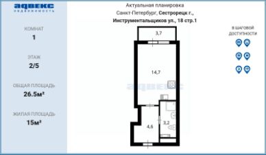 Квартира-студия, 30,7 м², 1/9 эт.Продаётся уютная квартира-студия в Красногвардейском районе Санкт-Петербурга, по адресу 6-я Жерновская ул., д. 7.О квартире:•Общая площадь — 30,7 м²•Жилая площадь — 24 м²•Этаж — 1 из 9•Лоджия застеклена•Дом монолитно-кирпичный, год постройки — 2014О доме и дворе:•9 этажей, пассажирский лифт•Во дворе оборудована детская площадка•Открытая парковка для жителейИнфраструктура и транспорт:•До метро 20 минут на трамвае Чижик•Рядом Ржевский лесопарк — отличное место для прогулок и активного отдыха•Удобный выезд на КАД•В шаговой доступности магазины и остановки транспортаДокументы:•1 собственник•Полная стоимость в договоре•Подходит под ипотеку•Есть небольшая ипотека, будет погашена перед сделкой Отличный вариант как для собственного проживания, так и для сдачи в аренду.Код пользователя: 189373Номер в базе: 9973495
