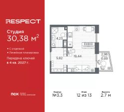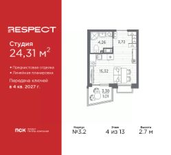 Продается 1-комн. квартира-студия с предчистовой отделкой в ЖК ''RESPECT'' на 12 этаже. Общая площадь: 23.82 кв.м., площадь гостиной 15.14 кв.м., из которых 5 кв.м. выделено под кухонную зону. Все окна выходят на одну сторону. В квартире один балкон, один совмещенный санузел. Высота потолков 2.7 м. Дом монолитный, многоподъездный, переменной этажности, от 10 до 13 этажей. Квартира находится в 1-й секции высотой 13 этажей в корпусе 3.2. На этаже 5 квартир. В подъезде 1 пассажирский и 1 грузовой лифт. Начало строительства - 3 квартал 2025 года. Окончание строительства - 4 квартал 2027 года. Оформление сделки по договору долевого участия. В шаговой доступности от жилого комплекса находятся станции метро (расстояние по прямой): ''Лесная'' (800 м), ''Площадь Мужества'' (1.4 км), ''Выборгская'' (1.9 км), также недалеко от этого корпуса расположены станции метро: ''Академическая'', ''Политехническая''. Квартал строится на Полюстровском пр, 87, в одной из самых востребованных локаций Петербурга. В 10 минутах пешком - метро ''Лесная'' и в 10 минутах на транспорте - Петроградская сторона. Высота домов от 7 до 13 этажей. На территории Respect строится школа на 1125 учащихся и детский сад на 240 мест. Запроектированы собственная газовая котельная, закрытая территория, дворы без машин и подземные паркинги с лифтами. Вентилируемые фасады облицованы клинкерным кирпичом. Дома из этого материала служат веками, являясь гордостью хозяев. Дизайн парадных зон и входных групп - сочетание лаконичности отделки и декоративных элементов с текстурами из натурального камня и дерева с приглушенной подсветкой теплым светом. Во входных группах расположены гостевые зоны с мягкой мебелью. Вся территория квартала будет связана единой концепцией благоустройства, разработанной ландшафтным бюро L.BURO. В основе - идея создания увлекательного ландшафтного пространства для насыщенной жизни, включающего в себя пейзажные зоны, современные архитектурные композиции, открытые террасы на стилобатах с зонами отдыха и парклетами, спортивными площадками. Это пространство для людей всех возрастов и различных увлечений. На эксплуатируемой кровле на уровне первого этажа в домах 1 и 4 будут обустроены общественные видовые террасы. В квартале запроектированы внутренние закрытые территории дворов домов без доступа автомобилей и безбарьерная среда для велосипедистов и колясок. Предусмотрены IP-домофония с функцией дистанционного открывания калиток и парадных, а также дистанционный сбор показаний счетчиков и мобильное приложение для жителей. Для безопасности жителей квартала - круглосуточное видеонаблюдение и служба охраны. В каждой квартире предусмотрены внешние корзины для кондиционеров. #2mbBva