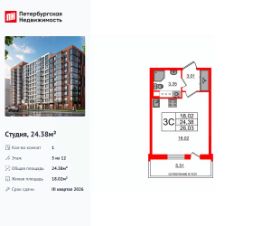 Продается просторная студия от застройщика в жилом комплексе ''Парадный ансамбль'' в престижном Московском районе.До метро можно добраться на транспорте всего за 20 минут.Удобная, классическая, функциональная европланировка, вместительная прихожая 3.2 м². Общая площадь студии - 24.54 м², жилая 18.23 м², высота потолка 3.07 м.Квартира продается с отделкой ''Норд Лайн светлый''.Что особенного в ЖК ''Парадный ансамбль''?• Инновационный Лицей Setl с оригинальной архитектурной концепцией и уникальной образовательной средой• Масштабное малоэтажное строительство в престижном Московском районе• Рекреационные зоны: парадный парк в центре квартала, ручей с собственной набережной, центральная площадь, ресторанный комплекс и пешеходный бульвар• Фасады из керамогранита и кирпича с яркими и акцентными входными группами• Две самые большие площадки Setl Kids и Setl Sport• Уникальные квартиры.High Flat на последних этажах, палисадники у квартир на первом этаже, семейные секции, квартиры с саунами и окном в ванной
