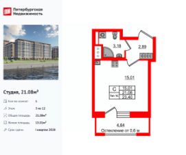 Продается уютная студия от застройщика в жилом комплексе ''Setl Ривьера'' в активно развивающимся Невском районе.До метро можно добраться на транспорте всего за 10 минут.Удобная, классическая, функциональная европланировка, вместительная прихожая 2.89 м². Общая площадь студии - 21.08 м², жилая 15.01 м², высота потолка 2.77 м.Квартира продается с отделкой ''Норд Лайн светлый плюс''.Что особенного в ЖК ''Setl Ривьера''?• Первая береговая линия Невы. 5 км до центра Петербурга• ''Активити парк'' - пространство для занятий спортом и отдыха. ''Ривьера парк'' с променадом и панорамной ротондой• Масштабные дворы 10 000 кв.м. с авторским ландшафтным дизайном• Двухуровневые единые входные группы• Видовые квартиры с террасами, каминами и саунами