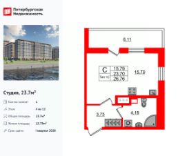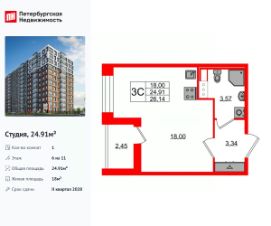 Продается просторная студия от застройщика в жилом комплексе ''Астра Континенталь'' в активно развивающимся Невском районе.До метро можно добраться пешком всего за 5 минут.Удобная, классическая, функциональная европланировка, просторная прихожая 3.34 м². Общая площадь студии - 24.91 м², жилая 18 м², высота потолка 2.77 м.Квартира продается с отделкой ''Норд Лайн серый плюс''.Что особенного в ЖК ''Астра Континенталь''?• Уникальная локация 400 метров до метро, 300 метров до благоустроенной набережной• Самодостаточный квартал со всей инфраструктурой в 3-х км от центра• Впечатляющий объем благоустройства: 30 000 кв. метров рекреационных зон с променадом и гейзерными фонтанами• Масштабный парк ''Город Спорта''