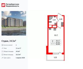 Продается просторная студия от застройщика в жилом комплексе ''Setl Ривьера'' в активно развивающимся Невском районе.До метро можно добраться на транспорте всего за 10 минут.Удобная, классическая, функциональная европланировка, вместительная прихожая 3.09 м². Общая площадь студии - 24.5 м², жилая 18.17 м², высота потолка 2.77 м.Квартира продается с отделкой ''Норд Лайн светлый плюс''.Что особенного в ЖК ''Setl Ривьера''?• Первая береговая линия Невы. 5 км до центра Петербурга• ''Активити парк'' - пространство для занятий спортом и отдыха. ''Ривьера парк'' с променадом и панорамной ротондой• Масштабные дворы 10 000 кв.м. с авторским ландшафтным дизайном• Двухуровневые единые входные группы• Видовые квартиры с террасами, каминами и саунами