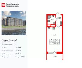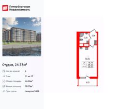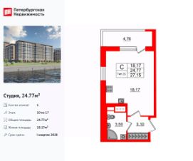 Продается просторная студия от застройщика в жилом комплексе ''Астра Континенталь'' в активно развивающимся Невском районе.До метро можно добраться пешком всего за 5 минут.Удобная, классическая, функциональная европланировка, вместительная прихожая 3.09 м². Общая площадь студии - 24.83 м², жилая 18.17 м², высота потолка 2.77 м.Квартира продается с отделкой ''Норд Лайн серый плюс''.Что особенного в ЖК ''Астра Континенталь''?• Уникальная локация 400 метров до метро, 300 метров до благоустроенной набережной• Самодостаточный квартал со всей инфраструктурой в 3-х км от центра• Впечатляющий объем благоустройства: 30 000 кв. метров рекреационных зон с променадом и гейзерными фонтанами• Масштабный парк ''Город Спорта''