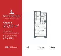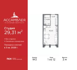 1-комн. квартира-студия от застройщика в Клубный квартал ''Ассамблея'' на 8 этаже. Квартира без отделки, полностью готова к ремонту. Общая площадь: 29.29 кв.м., площадь гостиной 19.43 кв.м., из которых 5 кв.м. выделено под кухонную зону. Все окна выходят на одну сторону. В квартире один балкон, один совмещенный санузел. Высота потолков 3 м. Дом монолитный, двухподъездный, высотой 12 этажей. Квартира находится во 2-й секции в корпусе 3. На этаже 6 квартир. В подъезде 1 пассажирский и 1 грузовой лифт. Начало строительства - 2 квартал 2025 года. Окончание строительства - 3 квартал 2028 года. Оформление сделки по договору долевого участия. В шаговой доступности от жилого комплекса имеются станции метро (расстояние по прямой): ''Горный институт'' (1.0 км), ''Василеостровская'' (1.4 км), ''Приморская'' (1.5 км), также недалеко от этого корпуса расположены станции метро: ''Спортивная'', ''Чкаловская''. ''Клубный квартал Ассамблея'' — проект бизнес-класса на Васильевском острове, в самом сердце исторического Петербурга. Комплекс состоит из пяти корпусов переменной этажности — от 7 до 12 этажей — с выразительной архитектурой в стиле неомодернизма: светлый клинкер, панорамное остекление, просторное лобби с потолками высотой почти 8 метров. Потолки — до 3,2 метров. Подземный паркинг на 667 машиномест. Комфорт и инфраструктура Проект ориентирован на комфортную городскую жизнь. В закрытом дворе — ландшафтное озеленение, современные детские и спортивные площадки. Внутренний клуб для резидентов включает коворкинг, переговорные, кинозал, фитнес и бьюти-зону. IP-домофония с просмотром камер видеонаблюдения, дистанционное открывание дверей и доступа на территорию и в парадную со смартфона и планшета, просмотр показаний счетчиков, приложение для жителей PSK Home. Локация Расположение на Васильевском острове — сильная сторона проекта. До четырех станций метро (''Горный институт'', ''Василеостровская'', ''Спортивная'', ''Приморская'') — 515 минут пешком. В шаговой доступности — зелёные зоны, культурные учреждения, в том числе сад ''Василеостровец'' и ДК имени Кирова. Основные магистрали Большой, Средний и Малый проспекты, Наличная и Уральская улицы. Съезд на ЗСД расположен недалеко от станции метро ''Приморская'', близ береговой линии. Благовещенский и Дворцовый мосты соединяют остров с центром города, а мосты Тучков, Биржевой и Бетанкура — с Петроградской стороной. Застройщик Группа компаний ПСК является одной из ведущих девелоперских компаний Санкт Петербурга. На протяжении 18 лет она возводит в Северной столице качественное жилье премиум, бизнес и комфорт-класса, социальные объекты школы и детские сады, апарт-отели и торговые центры. Является шестикратным обладателем золотого знака ''Надежный застройщик России''. #zseoMA