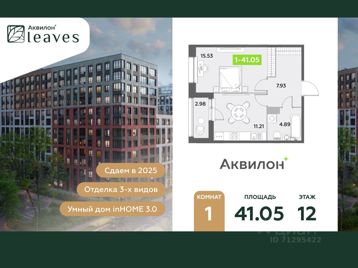 Купи квартиру в ЖК ''Аквилон Leaves''! Отделка В квартире выполнена предчистовая отделка WhiteBox +Возможен дозаказ отделки в любом из 3 цветов: SAND, TERRA, GRAPHITE Отделка входит в стоимость квартиры в ДДУ ЖК ''Аквилон Leaves'' Жилой комплекс класса бизнес-лайт ''Аквилон Leaves'' воплощает идеальную синергию природы, технологий и дизайна. В одном из самых престижных районов Санкт-Петербурга мы создаем функциональную жилую среду, которая позволит максимально быстро и удобно решать бытовые вопросы, сохраняя ценное время для семьи и любимых занятий. -Малошумные лифты -Сквозные парадные -Светопрозрачные входные группы -Увеличенная высота первого этажа -Безбарьерная среда -Подземный паркинг Стандарты Группы Аквилон для вашей комфортной жизни Thermo-S экономия на коммунальных платежах за счет дополнительно утепленных стен, кровли и цоколя. Энергоэффективные окна с селективным покрытием и аргоновым заполнением Soundstop - дополнительная шумоизоляция внутренних перегородок и межэтажных перекрытий, шумозащитные окна, малошумные лифты Light-in - в квартирах устанавливаются широкоформатные окна, увеличены на 30%. Высота подоконников на уровне 60 см от пола. Vent-in - в каждой комнате есть клапаны индивидуальной вентиляции, которые обеспечивают приток свежего воздуха с улицы. inHOME умный дом в каждой квартире Интеллектуальная цифровая система, которая позволит дистанционно решать бытовые вопросы, управлять квартирой и экономить на оплате коммунальных услуг. В состав inHOME входят: IP-домофон, Face key, ''умные'' счетчики, датчики протечки, дистанционное отключение розеток, и т.д. Двор ваш личный парк Благоустройство двора от студии ландшафтного дизайна MEGABUDKA отсылает нас к образу зеленого листа. Современная архитектура гармонирует с окружающей средой, а экологические стандарты и ''умные'' системы обеспечивают ежедневный комфорт. -Зонирование на площадки для активного и спокойного отдыха. -Ландшафт с геопластикой и рельефом напоминает естественную красоту природных парков. -Всесезонные растения -Высаживаются взрослые деревья и кустарники Локация и инфраструктура Помимо разнообразной инфраструктуры, рядом с комплексом расположен Пулковский парк и сад ''Дубовая роща''. У жителей будут все возможности для отдыха на свежем воздухе. Велопрогулка, пробежка или летний пикник наслаждайтесь природой, не уезжая далеко загород. -10 мин. до м. Московская -15 мин. до м. Звездная -15 мин. до аэропорта Пулково -30 мин. до Невского пр. #ZUcDe1