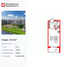 Продается просторная студия от застройщика в жилом комплексе ''Парадный ансамбль'' в престижном Московском районе.До метро можно добраться на транспорте всего за 20 минут.Удобная, классическая, функциональная европланировка, просторная прихожая 3.36 м². Общая площадь студии - 24.62 м², жилая 18.18 м², высота потолка 3.07 м.Квартира продается с отделкой ''NORD LINE WHITE''.Что особенного в ЖК ''Парадный ансамбль''?• Инновационный Лицей Setl с оригинальной архитектурной концепцией и уникальной образовательной средой• Масштабное малоэтажное строительство в престижном Московском районе• Рекреационные зоны: парадный парк в центре квартала, ручей с собственной набережной, центральная площадь, ресторанный комплекс и пешеходный бульвар• Фасады из керамогранита и кирпича с яркими и акцентными входными группами• Две самые большие площадки Setl Kids и Setl Sport• Уникальные квартиры.High Flat на последних этажах, палисадники у квартир на первом этаже, семейные секции, квартиры с саунами и окном в ванной