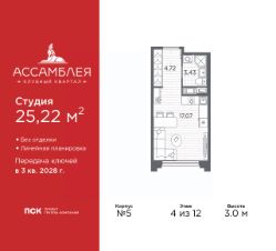 Объект забронирован клиентом!Продается 1-комн. квартира-студия в Клубный квартал ''Ассамблея'' на 4 этаже. Квартира без отделки, после выдачи ключей можно делать ремонт. Общая площадь: 25.22 кв.м., площадь гостиной 17.07 кв.м., из которых 5 кв.м. выделено под кухонную зону. Все окна выходят на одну сторону. В квартире один совмещенный санузел. Высота потолков 3.0 м. Дом монолитный, черырехподъездный, высотой 12 этажей. Квартира находится в 3-й секции в корпусе 5. На этаже 8 квартир. В подъезде 1 пассажирский и 1 грузовой лифт. Окончание строительства - 3 квартал 2028 года. Оформление сделки по договору долевого участия. В шаговой доступности от жилого комплекса находятся станции метро (расстояние по прямой): ''Горный институт'' (1.0 км), ''Василеостровская'' (1.4 км), ''Приморская'' (1.5 км), также недалеко от этого корпуса находятся станции метро: ''Спортивная'', ''Чкаловская''. ''Клубный квартал Ассамблея'' — проект бизнес-класса на Васильевском острове, в самом сердце исторического Петербурга. Комплекс состоит из пяти корпусов переменной этажности — от 7 до 12 этажей — с выразительной архитектурой в стиле неомодернизма: светлый клинкер, панорамное остекление, просторное лобби с потолками высотой почти 8 метров. Потолки — до 3,2 метров. Подземный паркинг на 667 машиномест. Комфорт и инфраструктура Проект ориентирован на комфортную городскую жизнь. В закрытом дворе — ландшафтное озеленение, современные детские и спортивные площадки. Внутренний клуб для резидентов включает коворкинг, переговорные, кинозал, фитнес и бьюти-зону. IP-домофония с просмотром камер видеонаблюдения, дистанционное открывание дверей и доступа на территорию и в парадную со смартфона и планшета, просмотр показаний счетчиков, приложение для жителей PSK Home. Локация Расположение на Васильевском острове — сильная сторона проекта. До четырех станций метро (''Горный институт'', ''Василеостровская'', ''Спортивная'', ''Приморская'') — 515 минут пешком. В шаговой доступности — зелёные зоны, культурные учреждения, в том числе сад ''Василеостровец'' и ДК имени Кирова. Основные магистрали Большой, Средний и Малый проспекты, Наличная и Уральская улицы. Съезд на ЗСД расположен недалеко от станции метро ''Приморская'', близ береговой линии. Благовещенский и Дворцовый мосты соединяют остров с центром города, а мосты Тучков, Биржевой и Бетанкура — с Петроградской стороной. Застройщик Группа компаний ПСК является одной из ведущих девелоперских компаний Санкт Петербурга. На протяжении 18 лет она возводит в Северной столице качественное жилье премиум, бизнес и комфорт-класса, социальные объекты школы и детские сады, апарт-отели и торговые центры. Является шестикратным обладателем золотого знака ''Надежный застройщик России''. #2MCo28