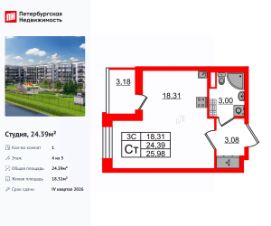 Продается уютная студия от застройщика в жилом комплексе ''Парадный ансамбль'' в престижном Московском районе.До метро можно добраться на транспорте всего за 20 минут.Удобная, классическая, функциональная европланировка, вместительная прихожая 3.14 м². Общая площадь студии - 24.25 м², жилая 18.07 м², высота потолка 3.07 м.Квартира продается с отделкой ''NORD LINE WHITE''.Что особенного в ЖК ''Парадный ансамбль''?• Инновационный Лицей Setl с оригинальной архитектурной концепцией и уникальной образовательной средой• Масштабное малоэтажное строительство в престижном Московском районе• Рекреационные зоны: парадный парк в центре квартала, ручей с собственной набережной, центральная площадь, ресторанный комплекс и пешеходный бульвар• Фасады из керамогранита и кирпича с яркими и акцентными входными группами• Две самые большие площадки Setl Kids и Setl Sport• Уникальные квартиры.High Flat на последних этажах, палисадники у квартир на первом этаже, семейные секции, квартиры с саунами и окном в ванной