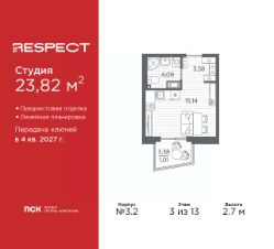 Просторная 1-комн. квартира-студия с предчистовой отделкой в ЖК ''RESPECT'' на 3 этаже. Общая площадь: 23.82 кв.м., площадь гостиной 15.14 кв.м., из которых 5 кв.м. выделено под кухонную зону. Все окна выходят на одну сторону. В квартире один балкон, один совмещенный санузел. Высота потолков 2.7 м. Квартира будет сдана с отделкой WHITE BOX, в которую включены следующие виды работ:- заливка стяжки,- установлена система отопления квартиры,- подготовлены потолки,- все стены выровнены, загрунтованы и отштукатурены,- электрическая проводка разведена по комнатам.Квартира будет готова к чистовой отделке. Дом монолитный, многоподъездный, переменной этажности, от 10 до 13 этажей. Квартира находится в 1-й секции высотой 13 этажей в корпусе 3.2. На этаже 5 квартир. В подъезде 1 пассажирский и 1 грузовой лифт. Начало строительства - 3 квартал 2025 года. Окончание строительства - 4 квартал 2027 года. Оформление сделки по договору долевого участия. В шаговой доступности от жилого комплекса имеются станции метро (расстояние по прямой): ''Лесная'' (800 м), ''Площадь Мужества'' (1.4 км), ''Выборгская'' (1.9 км), также недалеко от этого корпуса расположены станции метро: ''Академическая'', ''Политехническая''. Жилой квартал ''RESPECT'' строится на Полюстровском пр, 87, в одной из самых востребованных локаций Петербурга. В 10 минутах пешком - метро ''Лесная'' и в 10 минутах на транспорте - Петроградская сторона. Высота домов от 7 до 13 этажей. Квартиры сдаются с отделкой white box и с чистовой отделкой. На территории Respect строится школа на 1125 учащихся и детский сад на 240 мест. Запроектированы собственная газовая котельная, закрытая территория, дворы без машин и подземные паркинги с лифтами.В проекте предусмотрены трапециевидные балконы или остекленные лоджии, которые, с одной стороны, исключают монотонность фасада, являясь декоративными элементами, с другой дополнительным функциональным пространством в квартирах. Цветовая гармония фасадов каждого дома раскрывает характер квартала. Коричневый цвет клинкерного кирпича со структурой водяных штрихов — цвет уюта и безопасности, сдержанности и надёжности. Вентилируемые фасады облицованы клинкерным кирпичом. Его высокая прочность позволяет давать 100 лет гарантии на этот материал. Водопоглощение клинкерного кирпича составляет менее 5%, за счет чего у него высокая теплопроводность и прочность. В квартале запроектированы внутренние закрытые территории дворов домов без доступа автомобилей и безбарьерная среда для велосипедистов и колясок. Предусмотрены IP-домофония с функцией дистанционного открывания калиток и парадных, а также дистанционный сбор показаний счетчиков и мобильное приложение для жителей. Для безопасности жителей квартала - круглосуточное видеонаблюдение и служба охраны. В каждой квартире предусмотрены внешние корзины для кондиционеров. Вся территория квартала будет связана единой концепцией благоустройства, разработанной ландшафтным бюро L.BURO. На эксплуатируемой кровле на уровне первого э