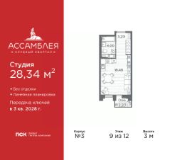 1-комн. квартира-студия от застройщика в Клубный квартал ''Ассамблея'' на 2 этаже. Квартира без отделки, после оформления собственности можно делать ремонт. Общая площадь: 25.9 кв.м., площадь гостиной 17.51 кв.м., из которых 5 кв.м. выделено под кухонную зону. Все окна выходят на одну сторону. В квартире один совмещенный санузел. Высота потолков 3.0 м. Дом монолитный, черырехподъездный, высотой 12 этажей. Квартира находится в 3-й секции в корпусе 5. На этаже 8 квартир. В подъезде 1 пассажирский и 1 грузовой лифт. Окончание строительства - 3 квартал 2028 года. Оформление сделки по договору долевого участия. В шаговой доступности от жилого комплекса находятся станции метро (расстояние по прямой): ''Горный институт'' (1.0 км), ''Василеостровская'' (1.4 км), ''Приморская'' (1.5 км), также недалеко от этого корпуса находятся станции метро: ''Спортивная'', ''Чкаловская''. ''Клубный квартал Ассамблея'' — проект бизнес-класса на Васильевском острове, в самом сердце исторического Петербурга. Комплекс состоит из пяти корпусов переменной этажности — от 7 до 12 этажей — с выразительной архитектурой в стиле неомодернизма: светлый клинкер, панорамное остекление, просторное лобби с потолками высотой почти 8 метров. Потолки — до 3,2 метров. Подземный паркинг на 667 машиномест. Комфорт и инфраструктура Проект ориентирован на комфортную городскую жизнь. В закрытом дворе — ландшафтное озеленение, современные детские и спортивные площадки. Внутренний клуб для резидентов включает коворкинг, переговорные, кинозал, фитнес и бьюти-зону. IP-домофония с просмотром камер видеонаблюдения, дистанционное открывание дверей и доступа на территорию и в парадную со смартфона и планшета, просмотр показаний счетчиков, приложение для жителей PSK Home. Локация Расположение на Васильевском острове — сильная сторона проекта. До четырех станций метро (''Горный институт'', ''Василеостровская'', ''Спортивная'', ''Приморская'') — 515 минут пешком. В шаговой доступности — зелёные зоны, культурные учреждения, в том числе сад ''Василеостровец'' и ДК имени Кирова. Основные магистрали Большой, Средний и Малый проспекты, Наличная и Уральская улицы. Съезд на ЗСД расположен недалеко от станции метро ''Приморская'', близ береговой линии. Благовещенский и Дворцовый мосты соединяют остров с центром города, а мосты Тучков, Биржевой и Бетанкура — с Петроградской стороной. Застройщик Группа компаний ПСК является одной из ведущих девелоперских компаний Санкт Петербурга. На протяжении 18 лет она возводит в Северной столице качественное жилье премиум, бизнес и комфорт-класса, социальные объекты школы и детские сады, апарт-отели и торговые центры. Является шестикратным обладателем золотого знака ''Надежный застройщик России''. #ZMb9CZ