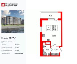 Продается просторная студия от застройщика в жилом комплексе ''Univer City'' в на юге Санкт-Петербурга.До метро можно добраться на транспорте всего за 30 минут.Удобная, классическая, функциональная европланировка, вместительная прихожая 3.06 м². Общая площадь студии - 24.75 м², жилая 18.03 м², высота потолка 2.77 м.Квартира продается с отделкой ''NORD LINE WHITE''.Что особенного в ЖК ''Univer City''?• Малоэтажное строительство• Скандинавские фасады с отделкой керамогранитом, акцентные входные группы• Закрытые внутренние дворы без машин• Пешеходный променад с тематическими зонами, еловый сквер и яблоневый сад• Univer Park, включая SetlSport и SetlKids, площадку для выгула собак и зоны отдыха• Инновационный Лицей Setl с оригинальной архитектурной концепцией и уникальной образовательной средой