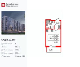 Продается уютная студия от застройщика в жилом комплексе ''Бионика Заповедная'' в динамичном Приморском районе.До метро можно добраться на транспорте всего за 11 минут.Удобная, классическая, функциональная европланировка, просторная прихожая 3.35 м². Общая площадь студии - 22.5 м², жилая 15.6 м², высота потолка 3 м.Квартира продается с отделкой ''NORD LINE SILVER ВК NEW''.Что особенного в ЖК ''Бионика Заповедная''?• Оазис в городе 3 минуты пешком до Новоорловского заказника (140 ГА)• Захватывающие виды из окон на хвойный лесопарк• Всесезонный ''Заповедный парк'' во дворе площадью 23000 кв.м.• 5 единых входных групп с авторским дизайном и лаундж-зонами, сити-виллы на первых этажах с палисадниками и высотой потолков до 4 м• Места притяжения: фонтан ''Бионика'', спортивный кластер со скейт-парком, фотозоны с арт-объектами