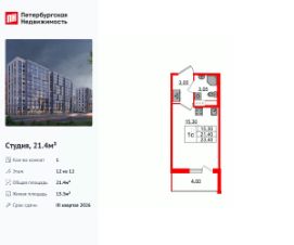 Продается уютная студия от застройщика в жилом комплексе ''Бионика Заповедная'' в динамичном Приморском районе.До метро можно добраться на транспорте всего за 11 минут.Удобная, классическая, функциональная европланировка, вместительная прихожая 3.05 м². Общая площадь студии - 21.4 м², жилая 15.3 м², высота потолка 3 м.Квартира продается с отделкой ''NORD LINE SILVER ВК NEW''.Что особенного в ЖК ''Бионика Заповедная''?• Оазис в городе 3 минуты пешком до Новоорловского заказника (140 ГА)• Захватывающие виды из окон на хвойный лесопарк• Всесезонный ''Заповедный парк'' во дворе площадью 23000 кв.м.• 5 единых входных групп с авторским дизайном и лаундж-зонами, сити-виллы на первых этажах с палисадниками и высотой потолков до 4 м• Места притяжения: фонтан ''Бионика'', спортивный кластер со скейт-парком, фотозоны с арт-объектами