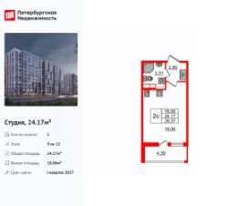 Продается уютная студия от застройщика в жилом комплексе ''Бионика Заповедная'' в динамичном Приморском районе.До метро можно добраться на транспорте всего за 11 минут.Удобная, классическая, функциональная европланировка, вместительная прихожая 2.8 м². Общая площадь студии - 24.17 м², жилая 18.06 м², высота потолка 2.77 м.Квартира продается с отделкой ''NORD LINE WHITE ВК NEW''.Что особенного в ЖК ''Бионика Заповедная''?• Оазис в городе 3 минуты пешком до Новоорловского заказника (140 ГА)• Захватывающие виды из окон на хвойный лесопарк• Всесезонный ''Заповедный парк'' во дворе площадью 23000 кв.м.• 5 единых входных групп с авторским дизайном и лаундж-зонами, сити-виллы на первых этажах с палисадниками и высотой потолков до 4 м• Места притяжения: фонтан ''Бионика'', спортивный кластер со скейт-парком, фотозоны с арт-объектами
