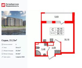 Продается просторная студия от застройщика в жилом комплексе ''Дворцовый фасад'' в неповторимом Петродворцовом районе.До метро можно добраться на транспорте всего за 25 минут.Удобная, классическая, функциональная европланировка, просторная прихожая 5.48 м². Общая площадь студии - 25.1 м², жилая 14.02 м², высота потолка 2.77 м.Квартира продается с отделкой ''NORD LINE WHITE''.Что особенного в ЖК ''Дворцовый фасад''?• В окружении дворцово-парковых ансамблей: Стрельна, Константиновский дворец, Петергоф, парк Новознаменка и Сосновая поляна, Шунгеровский лесопарк• Два собственных парка: парадный верхний для спокойного отдыха, нижний для активных занятий• Проект, соответствующий стандартам экологичного строительства, энергоэффективности, экономии и комфорта• Квартиры с саунами, возможностью установки камина и палисадниками• Малоэтажный жилой комплекс: всего 4 этажа, более половины квартир с увеличенной высотой потолка: от 3 до 5,5 м