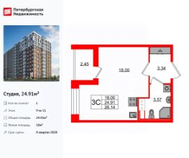 Продается просторная студия от застройщика в жилом комплексе ''Астра Континенталь'' в активно развивающимся Невском районе.До метро можно добраться пешком всего за 5 минут.Удобная, классическая, функциональная европланировка, просторная прихожая 3.34 м². Общая площадь студии - 24.91 м², жилая 18 м², высота потолка 2.77 м.Квартира продается с отделкой ''NORD LINE WHITE ВК NEW''.Что особенного в ЖК ''Астра Континенталь''?• Уникальная локация 400 метров до метро, 300 метров до благоустроенной набережной• Самодостаточный квартал со всей инфраструктурой в 3-х км от центра• Впечатляющий объем благоустройства: 30 000 кв. метров рекреационных зон с променадом и гейзерными фонтанами• Масштабный парк ''Город Спорта''