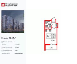 Продается уютная студия от застройщика в жилом комплексе ''Бионика Заповедная'' в динамичном Приморском районе.До метро можно добраться на транспорте всего за 11 минут.Удобная, классическая, функциональная европланировка, просторная прихожая 3.2 м². Общая площадь студии - 21.42 м², жилая 15 м², высота потолка 3 м.Квартира продается с отделкой ''NORD LINE SILVER ВК NEW''.Что особенного в ЖК ''Бионика Заповедная''?• Оазис в городе 3 минуты пешком до Новоорловского заказника (140 ГА)• Захватывающие виды из окон на хвойный лесопарк• Всесезонный ''Заповедный парк'' во дворе площадью 23000 кв.м.• 5 единых входных групп с авторским дизайном и лаундж-зонами, сити-виллы на первых этажах с палисадниками и высотой потолков до 4 м• Места притяжения: фонтан ''Бионика'', спортивный кластер со скейт-парком, фотозоны с арт-объектами