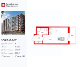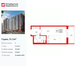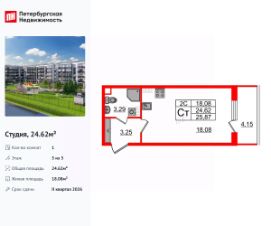 Продается просторная студия от застройщика в жилом комплексе ''Setl Ривьера'' в активно развивающимся Невском районе.До метро можно добраться на транспорте всего за 10 минут.Удобная, классическая, функциональная европланировка, вместительная прихожая 3.06 м². Общая площадь студии - 24.53 м², жилая 18.19 м², высота потолка 3.04 м.Квартира продается с отделкой ''NORD LINE WHITE ВК NEW''.Что особенного в ЖК ''Setl Ривьера''?• Первая береговая линия Невы. 5 км до центра Петербурга• ''Активити парк'' - пространство для занятий спортом и отдыха. ''Ривьера парк'' с променадом и панорамной ротондой• Масштабные дворы 10 000 кв.м. с авторским ландшафтным дизайном• Двухуровневые единые входные группы• Видовые квартиры с террасами, каминами и саунами