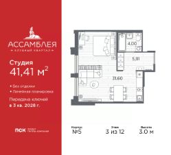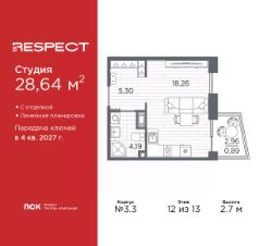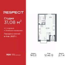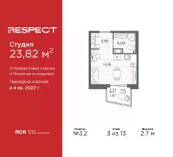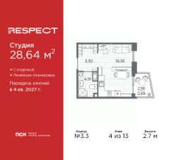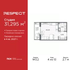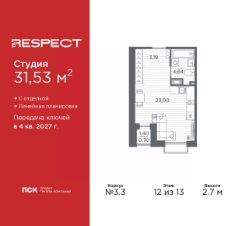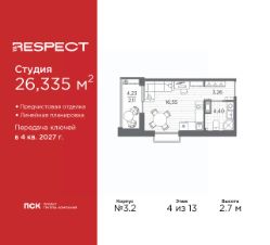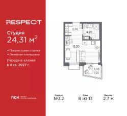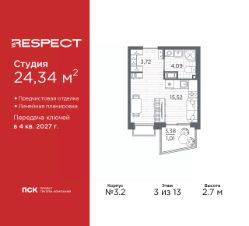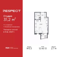 Однокомнатная квартира-студия с предчистовой отделкой в ЖК ''RESPECT'' на 3 этаже. Общая площадь: 32.8 кв.м., площадь гостиной 20.8 кв.м., из которых 5 кв.м. выделено под кухонную зону. Все окна выходят на одну сторону. В квартире один балкон, один совмещенный санузел. Высота потолков 2.7 м. Квартира будет сдана с отделкой WHITE BOX, в которую включены следующие виды работ:- заливка стяжки,- установлена система отопления квартиры,- подготовлены потолки,- все стены выровнены, загрунтованы и отштукатурены,- электрическая проводка разведена по комнатам.Квартира будет готова к чистовой отделке. Дом монолитный, многоподъездный, переменной этажности, от 10 до 13 этажей. Квартира находится в 1-й секции высотой 13 этажей в корпусе 3.2. На этаже 5 квартир. В подъезде 1 пассажирский и 1 грузовой лифт. Начало строительства - 3 квартал 2025 года. Окончание строительства - 4 квартал 2027 года. Оформление сделки по договору долевого участия. В шаговой доступности от жилого комплекса расположены станции метро (расстояние по прямой): ''Лесная'' (800 м), ''Площадь Мужества'' (1.4 км), ''Выборгская'' (1.9 км), также недалеко от этого корпуса находятся станции метро: ''Академическая'', ''Политехническая''. Жилой квартал ''RESPECT'' строится на Полюстровском пр, 87, в одной из самых востребованных локаций Петербурга. В 10 минутах пешком - метро ''Лесная'' и в 10 минутах на транспорте - Петроградская сторона. Высота домов от 7 до 13 этажей. Квартиры сдаются с отделкой white box и с чистовой отделкой. На территории Respect строится школа на 1125 учащихся и детский сад на 240 мест. Запроектированы собственная газовая котельная, закрытая территория, дворы без машин и подземные паркинги с лифтами.В проекте предусмотрены трапециевидные балконы или остекленные лоджии, которые, с одной стороны, исключают монотонность фасада, являясь декоративными элементами, с другой дополнительным функциональным пространством в квартирах. Цветовая гармония фасадов каждого дома раскрывает характер квартала. Коричневый цвет клинкерного кирпича со структурой водяных штрихов — цвет уюта и безопасности, сдержанности и надёжности. Вентилируемые фасады облицованы клинкерным кирпичом. Его высокая прочность позволяет давать 100 лет гарантии на этот материал. Водопоглощение клинкерного кирпича составляет менее 5%, за счет чего у него высокая теплопроводность и прочность. В квартале запроектированы внутренние закрытые территории дворов домов без доступа автомобилей и безбарьерная среда для велосипедистов и колясок. Предусмотрены IP-домофония с функцией дистанционного открывания калиток и парадных, а также дистанционный сбор показаний счетчиков и мобильное приложение для жителей. Для безопасности жителей квартала - круглосуточное видеонаблюдение и служба охраны. В каждой квартире предусмотрены внешние корзины для кондиционеров. Вся территория квартала будет связана единой концепцией благоустройства, разработанной ландшафтным бюро L.BURO. На эксплуатируемой кровле на уровне первого этажа