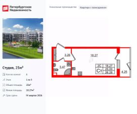 Продается просторная студия от застройщика в жилом комплексе ''Парадный ансамбль'' в престижном Московском районе.До метро можно добраться на транспорте всего за 20 минут.Удобная, классическая, функциональная европланировка, просторная прихожая 3.36 м². Общая площадь студии - 24.62 м², жилая 18.18 м², высота потолка 3.07 м.Квартира продается с отделкой ''NORD LINE WHITE''.Что особенного в ЖК ''Парадный ансамбль''?• Инновационный Лицей Setl с оригинальной архитектурной концепцией и уникальной образовательной средой• Масштабное малоэтажное строительство в престижном Московском районе• Рекреационные зоны: парадный парк в центре квартала, ручей с собственной набережной, центральная площадь, ресторанный комплекс и пешеходный бульвар• Фасады из керамогранита и кирпича с яркими и акцентными входными группами• Две самые большие площадки Setl Kids и Setl Sport• Уникальные квартиры.High Flat на последних этажах, палисадники у квартир на первом этаже, семейные секции, квартиры с саунами и окном в ванной