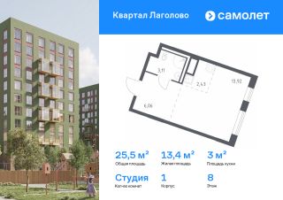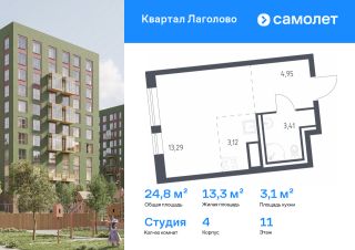 Строим кварталы для жизни с заботой о будущем. Предлагается квартира студия комфорт-класса 24,77 кв.м в корпусе 4 на 11 этаже, в ЖК ''Квартал Лаголово''Квартира с предчистовой отделкой. Доступность дополнительных опций уточняйте у застройщика.Приобрести квартиру возможно по специальным акциям от застройщика, с текущими условиями акций можно ознакомиться в блоке ''Акций''.Цена динамическая и может отличаться, уточняйте актуальность у застройщика.''Квартал Лаголово'' — жилой комплекс в Ломоносовском районе Ленинградской области. До сердца Петербурга — час на машине, до станции метро ''Проспект Ветеранов'' — 30 минут, до аэропорта Пулково — 35 минут. Рядом Гатчинский дворец, музей-заповедник ''Петергоф'', Дворцовый парк в Красном Селе и природный памятник ''Дудергофские высоты''. Три школы и восемь детских садов будут построены прямо на территории квартала. На первых этажах домов откроются магазины, салоны красоты, кабинет врача. Дома высотой до 11 этажей с панорамными балконами выполнены в скандинавском стиле. Занимайтесь йогой в воркаут-пространстве и бегайте по зеленому бульвару. Предусмотрели догхабы, площадь с амфитеатром и паркинги за пределами двора. В подъездах — безбарьерная среда, круглосуточное видеонаблюдение и специальные помещения для колясок и велосипедов. Все планировки в ''Квартале Лаголово'' — с увеличенными окнами.