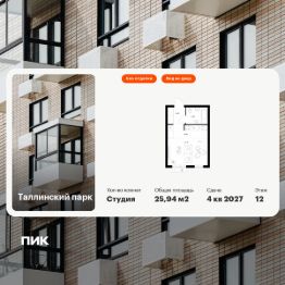 Объект забронирован клиентом!Продаётся квартира-студия площадью 25,94 кв.м на 9 этаже 12 этажного дома (Корпус 4.1, Секция 1) проекта ПИК Таллинский парк. Светлый просторный подъезд на уровне земли, функциональная планировка, большие окна, без отделки. ''Таллинский парк'' - проект в Ленинградской области, в районе Новоселье. До станции метро ''Проспект Ветеранов'' - 15 минут на автомобиле, а до КАД можно доехать всего за 4 минуты. ''Таллинский парк'' включает 16 жилых домов, детский сад и школу. В проекте появится центральный сквер с обильным озеленением, а через весь квартал протянутся широкие пешеходные бульвары. В зелёных дворах-парках будут оборудованы современные детские и спортивные площадки, обустроены места для отдыха. На первых этажах разместятся магазины, кафе и другие сервисы. Проектом предусмотрены персональные кладовые помещения - это доступный, экономичный и удобный способ хранения сезонных и крупногабаритных вещей. Освободите свою квартиру для полноценной жизни. Район Новоселье активно развивается в городском формате: здесь уже работают детские сады, школа и магазины. Для любителей зимних видов спорта открыта круглосуточная ледовая арена Ice Rink. За покупками и развлечениями также можно быстро доехать: 10 минут - и вы в Аутлете Fashion House Таллинское, гипермаркетах Лента, Леруа Мерлен и Окей. В 10 минутах на автомобиле находится Финский залив, на берегу которого расположились объекты культурного наследия. Рядом - Константиновский парк с отреставрированным дворцом, а чуть дальше расположена усадьба Знаменка. В великолепном Петергофе вы будете уже через 20 минут. Артикул 1026174 (Застройщик ООО ''СПЕЦИАЛИЗИРОВАННЫЙ ЗА СТРОЙЩИК ''СТРОЙ-ЭКСПЕРТ '') [cn_sbp_1807152]