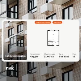 Объект забронирован клиентом!Продаётся квартира-студия площадью 27 кв.м на 12 этаже 12 этажного дома (Корпус 3.1, Секция 1) проекта ПИК Таллинский парк. Светлый просторный подъезд на уровне земли, функциональная планировка, большие окна, предчистовая отделка. ''Таллинский парк'' - проект в Ленинградской области, в районе Новоселье. До станции метро ''Проспект Ветеранов'' - 15 минут на автомобиле, а до КАД можно доехать всего за 4 минуты. ''Таллинский парк'' включает 16 жилых домов, детский сад и школу. В проекте появится центральный сквер с обильным озеленением, а через весь квартал протянутся широкие пешеходные бульвары. В зелёных дворах-парках будут оборудованы современные детские и спортивные площадки, обустроены места для отдыха. На первых этажах разместятся магазины, кафе и другие сервисы. Проектом предусмотрены персональные кладовые помещения - это доступный, экономичный и удобный способ хранения сезонных и крупногабаритных вещей. Освободите свою квартиру для полноценной жизни. Район Новоселье активно развивается в городском формате: здесь уже работают детские сады, школа и магазины. Для любителей зимних видов спорта открыта круглосуточная ледовая арена Ice Rink. За покупками и развлечениями также можно быстро доехать: 10 минут - и вы в Аутлете Fashion House Таллинское, гипермаркетах Лента, Леруа Мерлен и Окей. В 10 минутах на автомобиле находится Финский залив, на берегу которого расположились объекты культурного наследия. Рядом - Константиновский парк с отреставрированным дворцом, а чуть дальше расположена усадьба Знаменка. В великолепном Петергофе вы будете уже через 20 минут. Артикул 909761 (Застройщик ООО ''СПЕЦИАЛИЗИРОВАННЫЙ ЗА СТРОЙЩИК ''СТРОЙ-ЭКСПЕРТ '') [cn_sbp_1811888]
