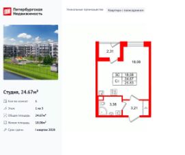 Продается просторная студия от застройщика в жилом комплексе ''Setl Ривьера'' в активно развивающимся Невском районе.До метро можно добраться на транспорте всего за 10 минут.Удобная, классическая, функциональная европланировка, вместительная прихожая 3.09 м². Общая площадь студии - 24.58 м², жилая 18.23 м², высота потолка 2.77 м.Квартира продается с отделкой ''NORD LINE SILVER ВК NEW''.Что особенного в ЖК ''Setl Ривьера''?• Первая береговая линия Невы. 5 км до центра Петербурга• ''Активити парк'' - пространство для занятий спортом и отдыха. ''Ривьера парк'' с променадом и панорамной ротондой• Масштабные дворы 10 000 кв.м. с авторским ландшафтным дизайном• Двухуровневые единые входные группы• Видовые квартиры с террасами, каминами и саунами