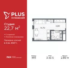 Продается однокомнатная квартира-студия с отделкой в ЖК ''PLUS Пулковский'' на 5 этаже. Общая площадь: 28.4 кв.м., площадь гостиной 18.3 кв.м., из которых 5 кв.м. выделено под кухонную зону. Все окна выходят на одну сторону. В квартире один совмещенный санузел. Высота потолков 2.89 м. Дом монолитный, трехподъездный, высотой 5 этажей. Квартира находится в 3-й секции в корпусе 10. На этаже 6 квартир. В подъезде 1 грузовой лифт. Окончание строительства - 2 квартал 2027 года. Оформление сделки по договору долевого участия. Уютный пятиэтажный city квартал PLUS Пулковский расположен в престижном Московском районе на пересечении Пулковского и Волхонского шоссе в новом формирующемся микрорайоне. Рядом проходит одна из важнейших транспортных артерий города Пулковское шоссе, а в 10 минутах езды два въезда на КАД и въезд на ЗСД. Благодаря удобному и быстрому выезду на Пулковское шоссе, можно легко добраться до центра города за 35 мин. До станций метро ''Московская'' и ''Купчино'' - 15 мин. на машине, а до аэропорта Пулково - 17 мин. В составе квартала: 30 пятиэтажных домов, школа со спортивным стадионом, 2 детских сада с бассейнами, наземные и подземные паркинги, центральный зеленый бульвар с play hub и местами отдыха. Благоустройство квартала продумано до мельчайших деталей, в его основе - забота о качестве жизни каждого жителя. Дома возводятся по современной монолитной технологии строительства с вентилируемыми фасадами. Благодаря большим увеличенным окнам и отсутствию высокоэтажных домов, во всех квартирах максимальный объем естественного света. В составе квартала запланированы социально-значимые объекты: школа на 825 мест со спортивным стадионом и бассейнами, два детских сада с бассейнами на 220 мест каждый. Территория квартала зонирована таким образом, чтобы автомобильные и пешеходные потоки и не пересекались. Прогулочные и велосипедные дорожки отделены от автомобильных проездов зелеными насаждениями. Дворы закрыты для машин, что дает чувство дополнительной безопасности для жителей особенно, для самых маленьких. Вся территория квартала безбарьерная. Здесь нет пандусов, резких перепадов высот или неудобных ступеней. Вход в парадные с уровня земли. В каждом дворе есть своя оборудованная детская площадка. А в центре микрорайона расположится большая игровая площадка play hub с пространством для командных игр. PLUS Пулковский располагается в молодом микрорайоне, который сейчас находится в стадии активного развития. Он будет обладать собственной развитой инфраструктурой. В радиусе 15 минут езды на автомобиле располагаются многочисленные магазины, супермаркеты, спортивные, образовательные и медицинские учреждения, парки и достопримечательности. Для автомашин предусмотрены отдельно стоящий 5-ти этажный паркинг на 958 машино-мест, две подземные парковки на 367 машино-мест и наземные парковочные зоны по внешнему периметру микрорайона. #ZMb6ew