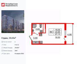 Продается просторная студия от застройщика в жилом комплексе ''Бионика Заповедная'' в динамичном Приморском районе.До метро можно добраться на транспорте всего за 11 минут.Удобная, классическая, функциональная европланировка, вместительная прихожая 3 м². Общая площадь студии - 24.65 м², жилая 18 м², высота потолка 2.77 м.Квартира продается с отделкой ''NORD LINE WHITE ВК NEW''.Что особенного в ЖК ''Бионика Заповедная''?• Оазис в городе 3 минуты пешком до Новоорловского заказника (140 ГА)• Захватывающие виды из окон на хвойный лесопарк• Всесезонный ''Заповедный парк'' во дворе площадью 23000 кв.м.• 5 единых входных групп с авторским дизайном и лаундж-зонами, сити-виллы на первых этажах с палисадниками и высотой потолков до 4 м• Места притяжения: фонтан ''Бионика'', спортивный кластер со скейт-парком, фотозоны с арт-объектами
