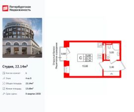 Строим кварталы для жизни с заботой о будущем. Предлагается студия комфорт-класса площадью 22,3 кв.м в корпусе 4 на 21-м этаже, в жилом комплексе ''Живи! В Рыбацком''.Выбирайте свое место для счастливой жизни: от уютной студии до просторной 3-комнатной квартиры. Хотите погрузиться в творческий процесс ремонта? Присмотритесь к вариантам предчистовой отделки. Если хотите сразу отпраздновать новоселье, поручите нам работы по отделке. Мы установим двери, окна и сантехнику, положим ламинат и плитку. На стенах будут обои, которые можно перекрашивать до 8 раз. По вашему желанию мы подготовим в вашей квартире все для комфортной жизни. Откройте дверь своим ключом и пройдитесь по комнатам. Там уже будет мебель, светильники и другие элементы декора. А на кухне бежевых оттенков есть все, чтобы сразу приготовить вкусный ужин для близких. Приобрести квартиру возможно по специальным акциям от застройщика, с текущими условиями акций можно ознакомиться в блоке ''Акций''.Цена динамическая и может отличаться, уточняйте актуальность у застройщика.Квартал ''Живи! В Рыбацком'' в Невском районе Санкт-Петербурга расположен рядом с рекой Славянкой и парком.Всего 20 минут пешей прогулки — и вы у метро ''Рыбацкое''. Автомобилисты будут добираться до КАДа за десять минут. В квартале работают два детских сада, школа и кабинет врача. На первых этажах зданий открыты магазины, кафе и салоны красоты.Во дворе — зеленые бульвары, воркаут-площадка, спортивный и игровой кластеры. Для машин — подземный паркинг. Кирпично-монолитные дома с каменной облицовкой — воплощение долговечности и тепла. Есть в квартале и камерный 30-й корпус, в нем восемь этажей, 70 квартир и приватный двор-парк.В сквозных парадных — безбарьерная среда, помещения для хранения колясок и велосипедов и система видеонаблюдения.