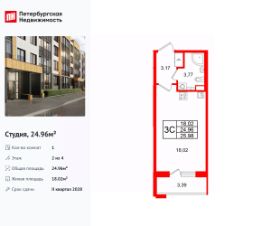Продается просторная студия от застройщика в жилом комплексе ''Парадный ансамбль'' в престижном Московском районе.До метро можно добраться на транспорте всего за 20 минут.Удобная, классическая, функциональная европланировка, вместительная прихожая 3.21 м². Общая площадь студии - 24.53 м², жилая 18.31 м², высота потолка 3.07 м.Квартира продается с отделкой ''NORD LINE WHITE''.Что особенного в ЖК ''Парадный ансамбль''?• Инновационный Лицей Setl с оригинальной архитектурной концепцией и уникальной образовательной средой• Масштабное малоэтажное строительство в престижном Московском районе• Рекреационные зоны: парадный парк в центре квартала, ручей с собственной набережной, центральная площадь, ресторанный комплекс и пешеходный бульвар• Фасады из керамогранита и кирпича с яркими и акцентными входными группами• Две самые большие площадки Setl Kids и Setl Sport• Уникальные квартиры.High Flat на последних этажах, палисадники у квартир на первом этаже, семейные секции, квартиры с саунами и окном в ванной