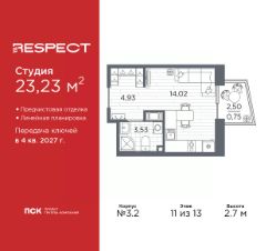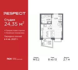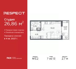 Продается однокомнатная квартира-студия с отделкой в ЖК ''RESPECT'' на 11 этаже. Общая площадь: 26.59 кв.м., площадь гостиной 16.82 кв.м., из которых 5 кв.м. выделено под кухонную зону. Все окна выходят на одну сторону. В квартире один балкон, один совмещенный санузел. Высота потолков 2.7 м. Дом монолитный, многоподъездный, переменной этажности, от 8 до 13 этажей. Квартира находится в 1-й секции высотой 13 этажей в корпусе 3.3. На этаже 6 квартир. В подъезде 1 пассажирский и 1 грузовой лифт. Начало строительства - 3 квартал 2025 года. Окончание строительства - 4 квартал 2027 года. Оформление сделки по договору долевого участия. В шаговой доступности от жилого комплекса расположены станции метро (расстояние по прямой): ''Лесная'' (800 м), ''Площадь Мужества'' (1.4 км), ''Выборгская'' (1.9 км), также недалеко от этого корпуса находятся станции метро: ''Академическая'', ''Политехническая''. Квартал строится на Полюстровском пр, 87, в одной из самых востребованных локаций Петербурга. В 10 минутах пешком - метро ''Лесная'' и в 10 минутах на транспорте - Петроградская сторона. Высота домов от 7 до 13 этажей. На территории Respect строится школа на 1125 учащихся и детский сад на 240 мест. Запроектированы собственная газовая котельная, закрытая территория, дворы без машин и подземные паркинги с лифтами. Вентилируемые фасады облицованы клинкерным кирпичом. Дома из этого материала служат веками, являясь гордостью хозяев. Дизайн парадных зон и входных групп - сочетание лаконичности отделки и декоративных элементов с текстурами из натурального камня и дерева с приглушенной подсветкой теплым светом. Во входных группах расположены гостевые зоны с мягкой мебелью. Вся территория квартала будет связана единой концепцией благоустройства, разработанной ландшафтным бюро L.BURO. В основе - идея создания увлекательного ландшафтного пространства для насыщенной жизни, включающего в себя пейзажные зоны, современные архитектурные композиции, открытые террасы на стилобатах с зонами отдыха и парклетами, спортивными площадками. Это пространство для людей всех возрастов и различных увлечений. На эксплуатируемой кровле на уровне первого этажа в домах 1 и 4 будут обустроены общественные видовые террасы. В квартале запроектированы внутренние закрытые территории дворов домов без доступа автомобилей и безбарьерная среда для велосипедистов и колясок. Предусмотрены IP-домофония с функцией дистанционного открывания калиток и парадных, а также дистанционный сбор показаний счетчиков и мобильное приложение для жителей. Для безопасности жителей квартала - круглосуточное видеонаблюдение и служба охраны. В каждой квартире предусмотрены внешние корзины для кондиционеров. #Z6BBfd