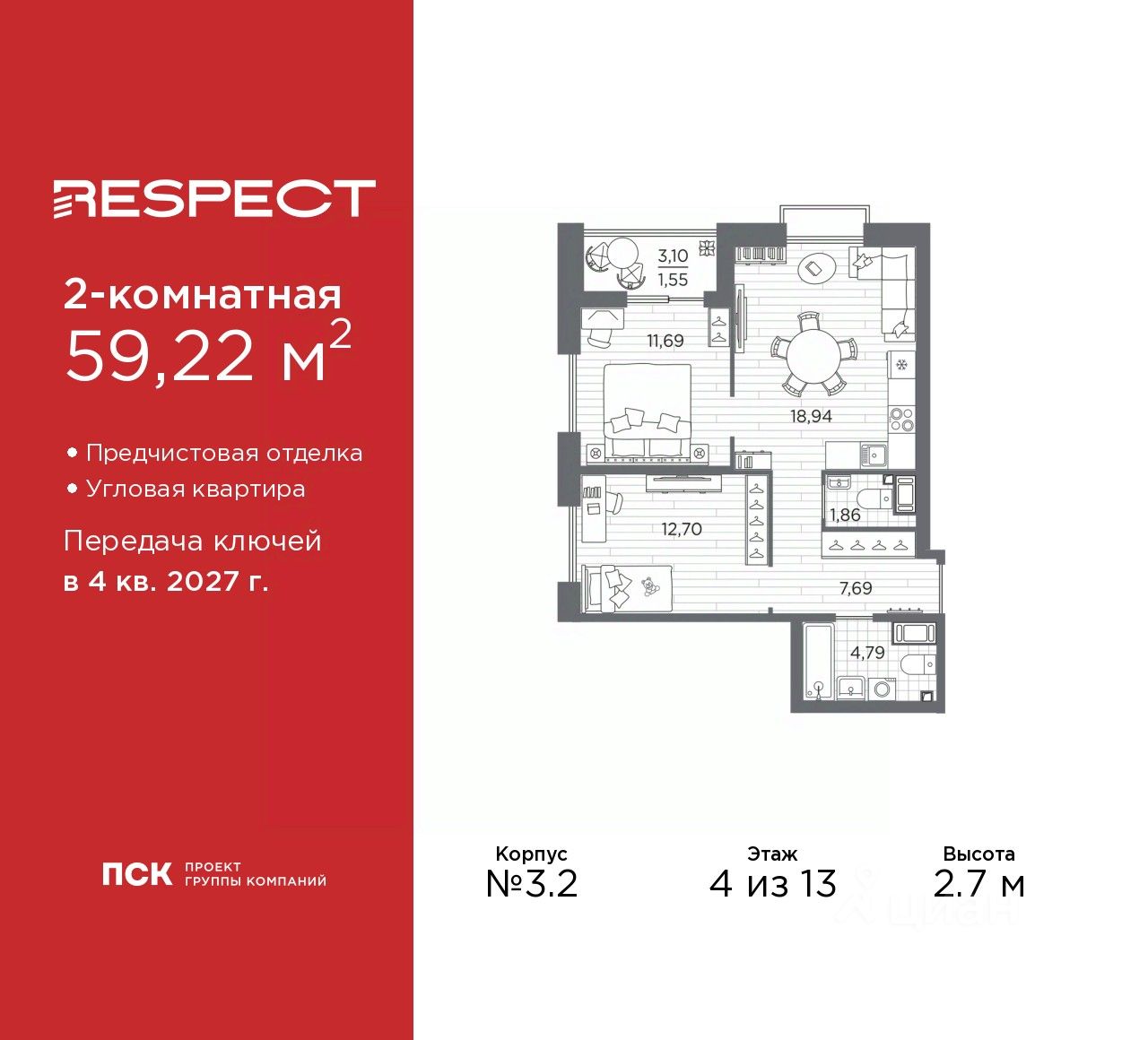 Просторная 2-комн. квартира с предчистовой отделкой в ЖК ''RESPECT'' на 4 этаже. Общая площадь: 59.22 кв.м., жилая: 24.39 кв.м., площадь просторной кухни-столовой: 18.94 кв.м. Угловая квартира, окна oбecпeчивaют paвнoмepнoe ocвeщeниe в тeчeниe дня. В квартире одна лоджия, один совмещенный и один раздельный санузел. Высота потолков 2.7 м. Дом монолитный, многоподъездный, переменной этажности, от 10 до 13 этажей. Квартира находится в 1-й секции высотой 13 этажей в корпусе 3.2. На этаже 5 квартир. В подъезде 1 пассажирский и 1 грузовой лифт. Начало строительства - 3 квартал 2025 года. Окончание строительства - 4 квартал 2027 года. Оформление сделки по договору долевого участия. В шаговой доступности от жилого комплекса находятся станции метро (расстояние по прямой): ''Лесная'' (800 м), ''Площадь Мужества'' (1.4 км), ''Выборгская'' (1.9 км), также недалеко от этого корпуса находятся станции метро: ''Академическая'', ''Политехническая''. Квартал строится на Полюстровском пр, 87, в одной из самых востребованных локаций Петербурга. В 10 минутах пешком - метро ''Лесная'' и в 10 минутах на транспорте - Петроградская сторона. Высота домов от 7 до 13 этажей. На территории Respect строится школа на 1125 учащихся и детский сад на 240 мест. Запроектированы собственная газовая котельная, закрытая территория, дворы без машин и подземные паркинги с лифтами. Вентилируемые фасады облицованы клинкерным кирпичом. Дома из этого материала служат веками, являясь гордостью хозяев. Дизайн парадных зон и входных групп - сочетание лаконичности отделки и декоративных элементов с текстурами из натурального камня и дерева с приглушенной подсветкой теплым светом. Во входных группах расположены гостевые зоны с мягкой мебелью. Вся территория квартала будет связана единой концепцией благоустройства, разработанной ландшафтным бюро L.BURO. В основе - идея создания увлекательного ландшафтного пространства для насыщенной жизни, включающего в себя пейзажные зоны, современные архитектурные композиции, открытые террасы на стилобатах с зонами отдыха и парклетами, спортивными площадками. Это пространство для людей всех возрастов и различных увлечений. На эксплуатируемой кровле на уровне первого этажа в домах 1 и 4 будут обустроены общественные видовые террасы. В квартале запроектированы внутренние закрытые территории дворов домов без доступа автомобилей и безбарьерная среда для велосипедистов и колясок. Предусмотрены IP-домофония с функцией дистанционного открывания калиток и парадных, а также дистанционный сбор показаний счетчиков и мобильное приложение для жителей. Для безопасности жителей квартала - круглосуточное видеонаблюдение и служба охраны. В каждой квартире предусмотрены внешние корзины для кондиционеров. #z6BbWt