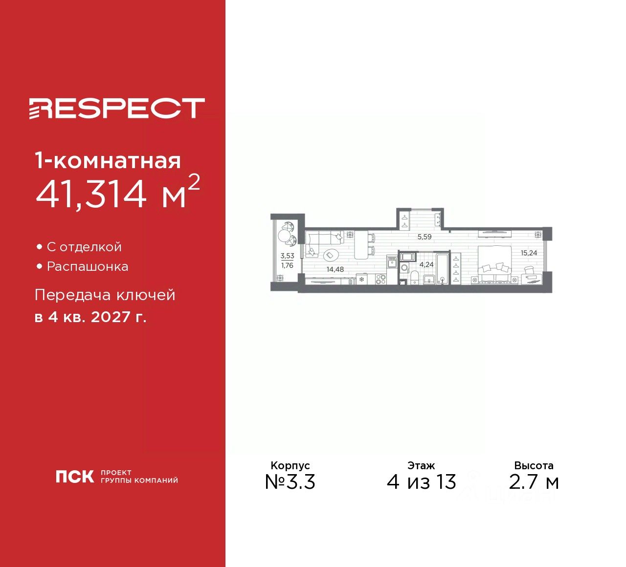 Однокомнатная квартира с отделкой в ЖК ''RESPECT'' на 4 этаже. Общая площадь: 41.314 кв.м., жилая: 15.24 кв.м., площадь просторной кухни-столовой: 14.48 кв.м. Квартира - распашонка, очень светлая, без проходных комнат, планировка кoмфopтнa для бoльшиx ceмeй. В квартире один балкон, один совмещенный санузел. Высота потолков 2.7 м. Дом монолитный, многоподъездный, переменной этажности, от 8 до 13 этажей. Квартира находится в 1-й секции высотой 13 этажей в корпусе 3.3. На этаже 6 квартир. В подъезде 1 пассажирский и 1 грузовой лифт. Начало строительства - 3 квартал 2025 года. Окончание строительства - 4 квартал 2027 года. Оформление сделки по договору долевого участия. В шаговой доступности от жилого комплекса находятся станции метро (расстояние по прямой): ''Лесная'' (800 м), ''Площадь Мужества'' (1.4 км), ''Выборгская'' (1.9 км), также недалеко от этого корпуса находятся станции метро: ''Академическая'', ''Политехническая''. Квартал строится на Полюстровском пр, 87, в одной из самых востребованных локаций Петербурга. В 10 минутах пешком - метро ''Лесная'' и в 10 минутах на транспорте - Петроградская сторона. Высота домов от 7 до 13 этажей. На территории Respect строится школа на 1125 учащихся и детский сад на 240 мест. Запроектированы собственная газовая котельная, закрытая территория, дворы без машин и подземные паркинги с лифтами. Вентилируемые фасады облицованы клинкерным кирпичом. Дома из этого материала служат веками, являясь гордостью хозяев. Дизайн парадных зон и входных групп - сочетание лаконичности отделки и декоративных элементов с текстурами из натурального камня и дерева с приглушенной подсветкой теплым светом. Во входных группах расположены гостевые зоны с мягкой мебелью. Вся территория квартала будет связана единой концепцией благоустройства, разработанной ландшафтным бюро L.BURO. В основе - идея создания увлекательного ландшафтного пространства для насыщенной жизни, включающего в себя пейзажные зоны, современные архитектурные композиции, открытые террасы на стилобатах с зонами отдыха и парклетами, спортивными площадками. Это пространство для людей всех возрастов и различных увлечений. На эксплуатируемой кровле на уровне первого этажа в домах 1 и 4 будут обустроены общественные видовые террасы. В квартале запроектированы внутренние закрытые территории дворов домов без доступа автомобилей и безбарьерная среда для велосипедистов и колясок. Предусмотрены IP-домофония с функцией дистанционного открывания калиток и парадных, а также дистанционный сбор показаний счетчиков и мобильное приложение для жителей. Для безопасности жителей квартала - круглосуточное видеонаблюдение и служба охраны. В каждой квартире предусмотрены внешние корзины для кондиционеров. #ZmBbD6