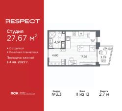 Однокомнатная квартира-студия с отделкой в ЖК ''RESPECT'' на 11 этаже. Общая площадь: 27.67 кв.м., площадь гостиной 17.98 кв.м., из которых 5 кв.м. выделено под кухонную зону. Все окна выходят на одну сторону. В квартире один балкон, один совмещенный санузел. Высота потолков 2.7 м. Дом монолитный, многоподъездный, переменной этажности, от 8 до 13 этажей. Квартира находится в 1-й секции высотой 13 этажей в корпусе 3.3. На этаже 6 квартир. В подъезде 1 пассажирский и 1 грузовой лифт. Начало строительства - 3 квартал 2025 года. Окончание строительства - 4 квартал 2027 года. Оформление сделки по договору долевого участия. В шаговой доступности от жилого комплекса находятся станции метро (расстояние по прямой): ''Лесная'' (800 м), ''Площадь Мужества'' (1.4 км), ''Выборгская'' (1.9 км), также недалеко от этого корпуса находятся станции метро: ''Академическая'', ''Политехническая''. Жилой квартал ''RESPECT'' строится на Полюстровском пр, 87, в одной из самых востребованных локаций Петербурга. В 10 минутах пешком - метро ''Лесная'' и в 10 минутах на транспорте - Петроградская сторона. Высота домов от 7 до 13 этажей. Квартиры сдаются с отделкой white box и с чистовой отделкой. На территории Respect строится школа на 1125 учащихся и детский сад на 240 мест. Запроектированы собственная газовая котельная, закрытая территория, дворы без машин и подземные паркинги с лифтами.В проекте предусмотрены трапециевидные балконы или остекленные лоджии, которые, с одной стороны, исключают монотонность фасада, являясь декоративными элементами, с другой дополнительным функциональным пространством в квартирах. Цветовая гармония фасадов каждого дома раскрывает характер квартала. Коричневый цвет клинкерного кирпича со структурой водяных штрихов — цвет уюта и безопасности, сдержанности и надёжности. Вентилируемые фасады облицованы клинкерным кирпичом. Его высокая прочность позволяет давать 100 лет гарантии на этот материал. Водопоглощение клинкерного кирпича составляет менее 5%, за счет чего у него высокая теплопроводность и прочность. В квартале запроектированы внутренние закрытые территории дворов домов без доступа автомобилей и безбарьерная среда для велосипедистов и колясок. Предусмотрены IP-домофония с функцией дистанционного открывания калиток и парадных, а также дистанционный сбор показаний счетчиков и мобильное приложение для жителей. Для безопасности жителей квартала - круглосуточное видеонаблюдение и служба охраны. В каждой квартире предусмотрены внешние корзины для кондиционеров. Вся территория квартала будет связана единой концепцией благоустройства, разработанной ландшафтным бюро L.BURO. На эксплуатируемой кровле на уровне первого этажа в домах 1 и 4 будут обустроены общественные видовые террасы. Это станет не только привлекательным местом с красивым видом, но и удобным, многофункциональным пространством. Дизайн парадных зон и входных групп - сочетание лаконичности отделки и декоративных элементов с текстурами из натурального камня и дерева с приглушенно