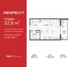Продается 1-комн. квартира-студия с предчистовой отделкой в ЖК ''RESPECT'' на 7 этаже. Общая площадь: 31.33 кв.м., площадь гостиной 20.2 кв.м., из которых 5 кв.м. выделено под кухонную зону. Все окна выходят на одну сторону. В квартире один балкон, один совмещенный санузел. Высота потолков 2.7 м. Дом монолитный, многоподъездный, переменной этажности, от 10 до 13 этажей. Квартира находится в 1-й секции высотой 13 этажей в корпусе 3.2. На этаже 5 квартир. В подъезде 1 пассажирский и 1 грузовой лифт. Начало строительства - 3 квартал 2025 года. Окончание строительства - 4 квартал 2027 года. Оформление сделки по договору долевого участия. В шаговой доступности от жилого комплекса расположены станции метро (расстояние по прямой): ''Лесная'' (800 м), ''Площадь Мужества'' (1.4 км), ''Выборгская'' (1.9 км), также недалеко от этого корпуса находятся станции метро: ''Академическая'', ''Политехническая''. Жилой квартал ''RESPECT'' строится на Полюстровском пр, 87, в одной из самых востребованных локаций Петербурга. В 10 минутах пешком - метро ''Лесная'' и в 10 минутах на транспорте - Петроградская сторона. Высота домов от 7 до 13 этажей. Квартиры сдаются с отделкой white box и с чистовой отделкой. На территории Respect строится школа на 1125 учащихся и детский сад на 240 мест. Запроектированы собственная газовая котельная, закрытая территория, дворы без машин и подземные паркинги с лифтами.В проекте предусмотрены трапециевидные балконы или остекленные лоджии, которые, с одной стороны, исключают монотонность фасада, являясь декоративными элементами, с другой дополнительным функциональным пространством в квартирах. Цветовая гармония фасадов каждого дома раскрывает характер квартала. Коричневый цвет клинкерного кирпича со структурой водяных штрихов — цвет уюта и безопасности, сдержанности и надёжности. Вентилируемые фасады облицованы клинкерным кирпичом. Его высокая прочность позволяет давать 100 лет гарантии на этот материал. Водопоглощение клинкерного кирпича составляет менее 5%, за счет чего у него высокая теплопроводность и прочность. В квартале запроектированы внутренние закрытые территории дворов домов без доступа автомобилей и безбарьерная среда для велосипедистов и колясок. Предусмотрены IP-домофония с функцией дистанционного открывания калиток и парадных, а также дистанционный сбор показаний счетчиков и мобильное приложение для жителей. Для безопасности жителей квартала - круглосуточное видеонаблюдение и служба охраны. В каждой квартире предусмотрены внешние корзины для кондиционеров. Вся территория квартала будет связана единой концепцией благоустройства, разработанной ландшафтным бюро L.BURO. На эксплуатируемой кровле на уровне первого этажа в домах 1 и 4 будут обустроены общественные видовые террасы. Это станет не только привлекательным местом с красивым видом, но и удобным, многофункциональным пространством. Дизайн парадных зон и входных групп - сочетание лаконичности отделки и декоративных элементов с текстурами из натурального камня и де