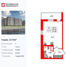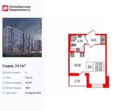 Продается уютная студия от застройщика в жилом комплексе ''Бионика Заповедная'' в динамичном Приморском районе.До метро можно добраться на транспорте всего за 11 минут.Удобная, классическая, функциональная европланировка, вместительная прихожая 3 м². Общая площадь студии - 24.3 м², жилая 18 м², высота потолка 2.77 м.Квартира продается с отделкой ''NORD LINE WHITE ВК NEW''.Что особенного в ЖК ''Бионика Заповедная''?• Оазис в городе 3 минуты пешком до Новоорловского заказника (140 ГА)• Захватывающие виды из окон на хвойный лесопарк• Всесезонный ''Заповедный парк'' во дворе площадью 23000 кв.м.• 5 единых входных групп с авторским дизайном и лаундж-зонами, сити-виллы на первых этажах с палисадниками и высотой потолков до 4 м• Места притяжения: фонтан ''Бионика'', спортивный кластер со скейт-парком, фотозоны с арт-объектами