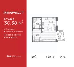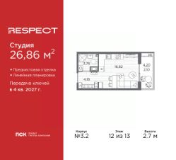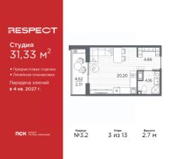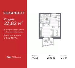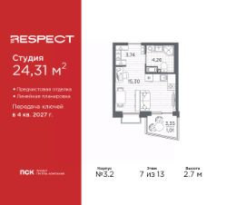 Просторная 1-комн. квартира-студия с отделкой в ЖК ''RESPECT'' на 11 этаже. Общая площадь: 27.02 кв.м., площадь гостиной 17.56 кв.м., из которых 5 кв.м. выделено под кухонную зону. Все окна выходят на одну сторону. В квартире один балкон, один совмещенный санузел. Высота потолков 2.7 м. В ЖК Respect представлены два варианта чистовой отделки: светлая и тёмная. Потолки: натяжные или выравнивание с окраской,Окна: из ПВХ профиля с двухкамерным стеклопакетом,Остекление балконов и лоджий: алюминиевое однослойное,Полы: покрытие из ламината, полы санузлов: керамическая плитка или керамогранит,Стены: обои под окраску, стены санузлов: керамическая плитка или керамогранит.Установлены межкомнатные двери.Санузел: раковина с тумбой, ванна или душевая кабина, унитаз, смесители. Выполнена полная разводка электропроводки. Дом монолитный, многоподъездный, переменной этажности, от 8 до 13 этажей. Квартира находится в 1-й секции высотой 13 этажей в корпусе 3.3. На этаже 6 квартир. В подъезде 1 пассажирский и 1 грузовой лифт. Начало строительства - 3 квартал 2025 года. Окончание строительства - 4 квартал 2027 года. Оформление сделки по договору долевого участия. В шаговой доступности от жилого комплекса имеются станции метро (расстояние по прямой): ''Лесная'' (800 м), ''Площадь Мужества'' (1.4 км), ''Выборгская'' (1.9 км), также недалеко от этого корпуса находятся станции метро: ''Академическая'', ''Политехническая''. Жилой квартал ''RESPECT'' строится на Полюстровском пр, 87, в одной из самых востребованных локаций Петербурга. В 10 минутах пешком - метро ''Лесная'' и в 10 минутах на транспорте - Петроградская сторона. Высота домов от 7 до 13 этажей. Квартиры сдаются с отделкой white box и с чистовой отделкой. На территории Respect строится школа на 1125 учащихся и детский сад на 240 мест. Запроектированы собственная газовая котельная, закрытая территория, дворы без машин и подземные паркинги с лифтами.В проекте предусмотрены трапециевидные балконы или остекленные лоджии, которые, с одной стороны, исключают монотонность фасада, являясь декоративными элементами, с другой дополнительным функциональным пространством в квартирах. Цветовая гармония фасадов каждого дома раскрывает характер квартала. Коричневый цвет клинкерного кирпича со структурой водяных штрихов — цвет уюта и безопасности, сдержанности и надёжности. Вентилируемые фасады облицованы клинкерным кирпичом. Его высокая прочность позволяет давать 100 лет гарантии на этот материал. Водопоглощение клинкерного кирпича составляет менее 5%, за счет чего у него высокая теплопроводность и прочность. В квартале запроектированы внутренние закрытые территории дворов домов без доступа автомобилей и безбарьерная среда для велосипедистов и колясок. Предусмотрены IP-домофония с функцией дистанционного открывания калиток и парадных, а также дистанционный сбор показаний счетчиков и мобильное приложение для жителей. Для безопасности жителей квартала - круглосуточное видеонаблюдение и служба охраны. В каждой квартире