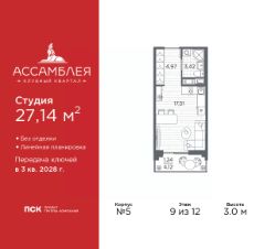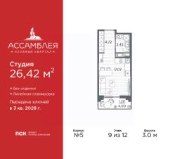 Однокомнатная квартира-студия от застройщика в Клубный квартал ''Ассамблея'' на 9 этаже. Квартира без отделки, новый собственник может сделать ремонт по индивидуальному проекту. Общая площадь: 26.42 кв.м., площадь гостиной 17.07 кв.м., из которых 5 кв.м. выделено под кухонную зону. Все окна выходят на одну сторону. В квартире один балкон, один совмещенный санузел. Высота потолков 3.0 м. Дом монолитный, черырехподъездный, высотой 12 этажей. Квартира находится в 3-й секции в корпусе 5. На этаже 8 квартир. В подъезде 1 пассажирский и 1 грузовой лифт. Окончание строительства - 3 квартал 2028 года. Оформление сделки по договору долевого участия. В шаговой доступности от жилого комплекса расположены станции метро (расстояние по прямой): ''Горный институт'' (1.0 км), ''Василеостровская'' (1.4 км), ''Приморская'' (1.5 км), также недалеко от этого корпуса расположены станции метро: ''Спортивная'', ''Чкаловская''. ''Клубный квартал Ассамблея'' — проект бизнес-класса на Васильевском острове, в самом сердце исторического Петербурга. Комплекс состоит из пяти корпусов переменной этажности — от 7 до 12 этажей — с выразительной архитектурой в стиле неомодернизма: светлый клинкер, панорамное остекление, просторное лобби с потолками высотой почти 8 метров. Потолки — до 3,2 метров. Подземный паркинг на 667 машиномест. Комфорт и инфраструктура Проект ориентирован на комфортную городскую жизнь. В закрытом дворе — ландшафтное озеленение, современные детские и спортивные площадки. Внутренний клуб для резидентов включает коворкинг, переговорные, кинозал, фитнес и бьюти-зону. IP-домофония с просмотром камер видеонаблюдения, дистанционное открывание дверей и доступа на территорию и в парадную со смартфона и планшета, просмотр показаний счетчиков, приложение для жителей PSK Home. Локация Расположение на Васильевском острове — сильная сторона проекта. До четырех станций метро (''Горный институт'', ''Василеостровская'', ''Спортивная'', ''Приморская'') — 515 минут пешком. В шаговой доступности — зелёные зоны, культурные учреждения, в том числе сад ''Василеостровец'' и ДК имени Кирова. Основные магистрали Большой, Средний и Малый проспекты, Наличная и Уральская улицы. Съезд на ЗСД расположен недалеко от станции метро ''Приморская'', близ береговой линии. Благовещенский и Дворцовый мосты соединяют остров с центром города, а мосты Тучков, Биржевой и Бетанкура — с Петроградской стороной. Застройщик Группа компаний ПСК является одной из ведущих девелоперских компаний Санкт Петербурга. На протяжении 18 лет она возводит в Северной столице качественное жилье премиум, бизнес и комфорт-класса, социальные объекты школы и детские сады, апарт-отели и торговые центры. Является шестикратным обладателем золотого знака ''Надежный застройщик России''. #zM29fv