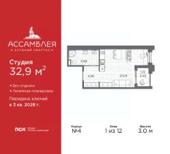 1-комн. квартира-студия в Клубный квартал ''Ассамблея'' на 1 этаже. Квартира без отделки, после выдачи ключей можно делать ремонт. Общая площадь: 32.9 кв.м., площадь гостиной 21.04 кв.м., из которых 5 кв.м. выделено под кухонную зону. Все окна выходят на одну сторону. В квартире одна лоджия, один совмещенный санузел. Высота потолков 3.0 м. Дом монолитный, трехподъездный, высотой 12 этажей. Квартира находится в 3-й секции в корпусе 4. На этаже 9 квартир. В подъезде 1 пассажирский и 1 грузовой лифт. Начало строительства - 3 квартал 2025 года. Окончание строительства - 3 квартал 2028 года. Оформление сделки по договору долевого участия. В шаговой доступности от жилого комплекса расположены станции метро (расстояние по прямой): ''Горный институт'' (1.0 км), ''Василеостровская'' (1.4 км), ''Приморская'' (1.5 км), также недалеко от этого корпуса находятся станции метро: ''Спортивная'', ''Чкаловская''. ''Клубный квартал Ассамблея'' — проект бизнес-класса на Васильевском острове, в самом сердце исторического Петербурга. Комплекс состоит из пяти корпусов переменной этажности — от 7 до 12 этажей — с выразительной архитектурой в стиле неомодернизма: светлый клинкер, панорамное остекление, просторное лобби с потолками высотой почти 8 метров. Потолки — до 3,2 метров. Подземный паркинг на 667 машиномест. Комфорт и инфраструктура Проект ориентирован на комфортную городскую жизнь. В закрытом дворе — ландшафтное озеленение, современные детские и спортивные площадки. Внутренний клуб для резидентов включает коворкинг, переговорные, кинозал, фитнес и бьюти-зону. IP-домофония с просмотром камер видеонаблюдения, дистанционное открывание дверей и доступа на территорию и в парадную со смартфона и планшета, просмотр показаний счетчиков, приложение для жителей PSK Home. Локация Расположение на Васильевском острове — сильная сторона проекта. До четырех станций метро (''Горный институт'', ''Василеостровская'', ''Спортивная'', ''Приморская'') — 515 минут пешком. В шаговой доступности — зелёные зоны, культурные учреждения, в том числе сад ''Василеостровец'' и ДК имени Кирова. Основные магистрали Большой, Средний и Малый проспекты, Наличная и Уральская улицы. Съезд на ЗСД расположен недалеко от станции метро ''Приморская'', близ береговой линии. Благовещенский и Дворцовый мосты соединяют остров с центром города, а мосты Тучков, Биржевой и Бетанкура — с Петроградской стороной. Застройщик Группа компаний ПСК является одной из ведущих девелоперских компаний Санкт Петербурга. На протяжении 18 лет она возводит в Северной столице качественное жилье премиум, бизнес и комфорт-класса, социальные объекты школы и детские сады, апарт-отели и торговые центры. Является шестикратным обладателем золотого знака ''Надежный застройщик России''. #zmiCZ6
