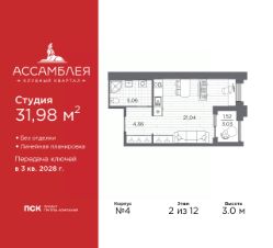 Продается однокомнатная квартира-студия в Клубный квартал ''Ассамблея'' на 2 этаже. Квартира без отделки, полностью готова к ремонту. Общая площадь: 31.98 кв.м., площадь гостиной 21.04 кв.м., из которых 5 кв.м. выделено под кухонную зону. Все окна выходят на одну сторону. В квартире одна лоджия, один совмещенный санузел. Высота потолков 3.0 м. Дом монолитный, трехподъездный, высотой 12 этажей. Квартира находится в 3-й секции в корпусе 4. На этаже 9 квартир. В подъезде 1 пассажирский и 1 грузовой лифт. Начало строительства - 3 квартал 2025 года. Окончание строительства - 3 квартал 2028 года. Оформление сделки по договору долевого участия. В шаговой доступности от жилого комплекса находятся станции метро (расстояние по прямой): ''Горный институт'' (1.0 км), ''Василеостровская'' (1.4 км), ''Приморская'' (1.5 км), также недалеко от этого корпуса расположены станции метро: ''Спортивная'', ''Чкаловская''. ''Клубный квартал Ассамблея'' — проект бизнес-класса на Васильевском острове, в самом сердце исторического Петербурга. Комплекс состоит из пяти корпусов переменной этажности — от 7 до 12 этажей — с выразительной архитектурой в стиле неомодернизма: светлый клинкер, панорамное остекление, просторное лобби с потолками высотой почти 8 метров. Потолки — до 3,2 метров. Подземный паркинг на 667 машиномест. Комфорт и инфраструктура Проект ориентирован на комфортную городскую жизнь. В закрытом дворе — ландшафтное озеленение, современные детские и спортивные площадки. Внутренний клуб для резидентов включает коворкинг, переговорные, кинозал, фитнес и бьюти-зону. IP-домофония с просмотром камер видеонаблюдения, дистанционное открывание дверей и доступа на территорию и в парадную со смартфона и планшета, просмотр показаний счетчиков, приложение для жителей PSK Home. Локация Расположение на Васильевском острове — сильная сторона проекта. До четырех станций метро (''Горный институт'', ''Василеостровская'', ''Спортивная'', ''Приморская'') — 515 минут пешком. В шаговой доступности — зелёные зоны, культурные учреждения, в том числе сад ''Василеостровец'' и ДК имени Кирова. Основные магистрали Большой, Средний и Малый проспекты, Наличная и Уральская улицы. Съезд на ЗСД расположен недалеко от станции метро ''Приморская'', близ береговой линии. Благовещенский и Дворцовый мосты соединяют остров с центром города, а мосты Тучков, Биржевой и Бетанкура — с Петроградской стороной. Застройщик Группа компаний ПСК является одной из ведущих девелоперских компаний Санкт Петербурга. На протяжении 18 лет она возводит в Северной столице качественное жилье премиум, бизнес и комфорт-класса, социальные объекты школы и детские сады, апарт-отели и торговые центры. Является шестикратным обладателем золотого знака ''Надежный застройщик России''. #261CzE