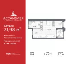 Продается 1-комн. квартира-студия в Клубный квартал ''Ассамблея'' на 8 этаже. Квартира без отделки, новый владелец может сделать ремонт по индивидуальному дизайн-проекту. Общая площадь: 31.98 кв.м., площадь гостиной 21.04 кв.м., из которых 5 кв.м. выделено под кухонную зону. Все окна выходят на одну сторону. В квартире одна лоджия, один совмещенный санузел. Высота потолков 3.0 м. Дом монолитный, трехподъездный, высотой 12 этажей. Квартира находится в 3-й секции в корпусе 4. На этаже 9 квартир. В подъезде 1 пассажирский и 1 грузовой лифт. Начало строительства - 3 квартал 2025 года. Окончание строительства - 3 квартал 2028 года. Оформление сделки по договору долевого участия. В шаговой доступности от жилого комплекса имеются станции метро (расстояние по прямой): ''Горный институт'' (1.0 км), ''Василеостровская'' (1.4 км), ''Приморская'' (1.5 км), также недалеко от этого корпуса расположены станции метро: ''Спортивная'', ''Чкаловская''. ''Клубный квартал Ассамблея'' — проект бизнес-класса на Васильевском острове, в самом сердце исторического Петербурга. Комплекс состоит из пяти корпусов переменной этажности — от 7 до 12 этажей — с выразительной архитектурой в стиле неомодернизма: светлый клинкер, панорамное остекление, просторное лобби с потолками высотой почти 8 метров. Потолки — до 3,2 метров. Подземный паркинг на 667 машиномест. Комфорт и инфраструктура Проект ориентирован на комфортную городскую жизнь. В закрытом дворе — ландшафтное озеленение, современные детские и спортивные площадки. Внутренний клуб для резидентов включает коворкинг, переговорные, кинозал, фитнес и бьюти-зону. IP-домофония с просмотром камер видеонаблюдения, дистанционное открывание дверей и доступа на территорию и в парадную со смартфона и планшета, просмотр показаний счетчиков, приложение для жителей PSK Home. Локация Расположение на Васильевском острове — сильная сторона проекта. До четырех станций метро (''Горный институт'', ''Василеостровская'', ''Спортивная'', ''Приморская'') — 515 минут пешком. В шаговой доступности — зелёные зоны, культурные учреждения, в том числе сад ''Василеостровец'' и ДК имени Кирова. Основные магистрали Большой, Средний и Малый проспекты, Наличная и Уральская улицы. Съезд на ЗСД расположен недалеко от станции метро ''Приморская'', близ береговой линии. Благовещенский и Дворцовый мосты соединяют остров с центром города, а мосты Тучков, Биржевой и Бетанкура — с Петроградской стороной. Застройщик Группа компаний ПСК является одной из ведущих девелоперских компаний Санкт Петербурга. На протяжении 18 лет она возводит в Северной столице качественное жилье премиум, бизнес и комфорт-класса, социальные объекты школы и детские сады, апарт-отели и торговые центры. Является шестикратным обладателем золотого знака ''Надежный застройщик России''. #zMICw9