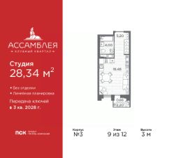 Продается однокомнатная квартира-студия в Клубный квартал ''Ассамблея'' на 9 этаже. Квартира без отделки, после оформления собственности можно делать ремонт. Общая площадь: 28.34 кв.м., площадь гостиной 18.48 кв.м., из которых 5 кв.м. выделено под кухонную зону. Все окна выходят на одну сторону. В квартире один балкон, один совмещенный санузел. Высота потолков 3 м. Дом монолитный, двухподъездный, высотой 12 этажей. Квартира находится в 1-й секции в корпусе 3. На этаже 6 квартир. В подъезде 1 пассажирский и 1 грузовой лифт. Начало строительства - 2 квартал 2025 года. Окончание строительства - 3 квартал 2028 года. Оформление сделки по договору долевого участия. В шаговой доступности от жилого комплекса имеются станции метро (расстояние по прямой): ''Горный институт'' (1.0 км), ''Василеостровская'' (1.4 км), ''Приморская'' (1.5 км), также недалеко от этого корпуса расположены станции метро: ''Спортивная'', ''Чкаловская''. ''Клубный квартал Ассамблея'' — проект бизнес-класса на Васильевском острове, в самом сердце исторического Петербурга. Комплекс состоит из пяти корпусов переменной этажности — от 7 до 12 этажей — с выразительной архитектурой в стиле неомодернизма: светлый клинкер, панорамное остекление, просторное лобби с потолками высотой почти 8 метров. Потолки — до 3,2 метров. Подземный паркинг на 667 машиномест. Комфорт и инфраструктура Проект ориентирован на комфортную городскую жизнь. В закрытом дворе — ландшафтное озеленение, современные детские и спортивные площадки. Внутренний клуб для резидентов включает коворкинг, переговорные, кинозал, фитнес и бьюти-зону. IP-домофония с просмотром камер видеонаблюдения, дистанционное открывание дверей и доступа на территорию и в парадную со смартфона и планшета, просмотр показаний счетчиков, приложение для жителей PSK Home. Локация Расположение на Васильевском острове — сильная сторона проекта. До четырех станций метро (''Горный институт'', ''Василеостровская'', ''Спортивная'', ''Приморская'') — 515 минут пешком. В шаговой доступности — зелёные зоны, культурные учреждения, в том числе сад ''Василеостровец'' и ДК имени Кирова. Основные магистрали Большой, Средний и Малый проспекты, Наличная и Уральская улицы. Съезд на ЗСД расположен недалеко от станции метро ''Приморская'', близ береговой линии. Благовещенский и Дворцовый мосты соединяют остров с центром города, а мосты Тучков, Биржевой и Бетанкура — с Петроградской стороной. Застройщик Группа компаний ПСК является одной из ведущих девелоперских компаний Санкт Петербурга. На протяжении 18 лет она возводит в Северной столице качественное жилье премиум, бизнес и комфорт-класса, социальные объекты школы и детские сады, апарт-отели и торговые центры. Является шестикратным обладателем золотого знака ''Надежный застройщик России''. #z5fSwE