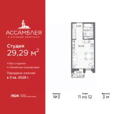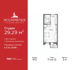 Просторная однокомнатная квартира-студия в Клубный квартал ''Ассамблея'' на 11 этаже. Квартира без отделки, полностью готова к ремонту. Общая площадь: 29.29 кв.м., площадь гостиной 19.43 кв.м., из которых 5 кв.м. выделено под кухонную зону. Все окна выходят на одну сторону. В квартире один балкон, один совмещенный санузел. Высота потолков 3 м. Дом монолитный, двухподъездный, высотой 12 этажей. Квартира находится в 1-й секции в корпусе 3. На этаже 6 квартир. В подъезде 1 пассажирский и 1 грузовой лифт. Начало строительства - 2 квартал 2025 года. Окончание строительства - 3 квартал 2028 года. Оформление сделки по договору долевого участия. В шаговой доступности от жилого комплекса находятся станции метро (расстояние по прямой): ''Горный институт'' (1.0 км), ''Василеостровская'' (1.4 км), ''Приморская'' (1.5 км), также недалеко от этого корпуса расположены станции метро: ''Спортивная'', ''Чкаловская''. ''Клубный квартал Ассамблея'' — проект бизнес-класса на Васильевском острове, в самом сердце исторического Петербурга. Комплекс состоит из пяти корпусов переменной этажности — от 7 до 12 этажей — с выразительной архитектурой в стиле неомодернизма: светлый клинкер, панорамное остекление, просторное лобби с потолками высотой почти 8 метров. Потолки — до 3,2 метров. Подземный паркинг на 667 машиномест. Комфорт и инфраструктура Проект ориентирован на комфортную городскую жизнь. В закрытом дворе — ландшафтное озеленение, современные детские и спортивные площадки. Внутренний клуб для резидентов включает коворкинг, переговорные, кинозал, фитнес и бьюти-зону. IP-домофония с просмотром камер видеонаблюдения, дистанционное открывание дверей и доступа на территорию и в парадную со смартфона и планшета, просмотр показаний счетчиков, приложение для жителей PSK Home. Локация Расположение на Васильевском острове — сильная сторона проекта. До четырех станций метро (''Горный институт'', ''Василеостровская'', ''Спортивная'', ''Приморская'') — 515 минут пешком. В шаговой доступности — зелёные зоны, культурные учреждения, в том числе сад ''Василеостровец'' и ДК имени Кирова. Основные магистрали Большой, Средний и Малый проспекты, Наличная и Уральская улицы. Съезд на ЗСД расположен недалеко от станции метро ''Приморская'', близ береговой линии. Благовещенский и Дворцовый мосты соединяют остров с центром города, а мосты Тучков, Биржевой и Бетанкура — с Петроградской стороной. Застройщик Группа компаний ПСК является одной из ведущих девелоперских компаний Санкт Петербурга. На протяжении 18 лет она возводит в Северной столице качественное жилье премиум, бизнес и комфорт-класса, социальные объекты школы и детские сады, апарт-отели и торговые центры. Является шестикратным обладателем золотого знака ''Надежный застройщик России''. #zsfs5z