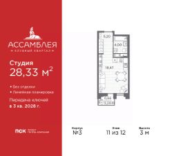 Просторная 1-комн. квартира-студия в Клубный квартал ''Ассамблея'' на 11 этаже. Квартира без отделки, новый собственник может сделать ремонт по своему дизайн-проекту. Общая площадь: 28.34 кв.м., площадь гостиной 18.48 кв.м., из которых 5 кв.м. выделено под кухонную зону. Все окна выходят на одну сторону. В квартире один балкон, один совмещенный санузел. Высота потолков 3 м. Дом монолитный, двухподъездный, высотой 12 этажей. Квартира находится во 2-й секции в корпусе 3. На этаже 6 квартир. В подъезде 1 пассажирский и 1 грузовой лифт. Начало строительства - 2 квартал 2025 года. Окончание строительства - 3 квартал 2028 года. Оформление сделки по договору долевого участия. В шаговой доступности от жилого комплекса находятся станции метро (расстояние по прямой): ''Горный институт'' (1.0 км), ''Василеостровская'' (1.4 км), ''Приморская'' (1.5 км), также недалеко от этого корпуса находятся станции метро: ''Спортивная'', ''Чкаловская''. ''Клубный квартал Ассамблея'' — проект бизнес-класса на Васильевском острове, в самом сердце исторического Петербурга. Комплекс состоит из пяти корпусов переменной этажности — от 7 до 12 этажей — с выразительной архитектурой в стиле неомодернизма: светлый клинкер, панорамное остекление, просторное лобби с потолками высотой почти 8 метров. Потолки — до 3,2 метров. Подземный паркинг на 667 машиномест. Комфорт и инфраструктура Проект ориентирован на комфортную городскую жизнь. В закрытом дворе — ландшафтное озеленение, современные детские и спортивные площадки. Внутренний клуб для резидентов включает коворкинг, переговорные, кинозал, фитнес и бьюти-зону. IP-домофония с просмотром камер видеонаблюдения, дистанционное открывание дверей и доступа на территорию и в парадную со смартфона и планшета, просмотр показаний счетчиков, приложение для жителей PSK Home. Локация Расположение на Васильевском острове — сильная сторона проекта. До четырех станций метро (''Горный институт'', ''Василеостровская'', ''Спортивная'', ''Приморская'') — 515 минут пешком. В шаговой доступности — зелёные зоны, культурные учреждения, в том числе сад ''Василеостровец'' и ДК имени Кирова. Основные магистрали Большой, Средний и Малый проспекты, Наличная и Уральская улицы. Съезд на ЗСД расположен недалеко от станции метро ''Приморская'', близ береговой линии. Благовещенский и Дворцовый мосты соединяют остров с центром города, а мосты Тучков, Биржевой и Бетанкура — с Петроградской стороной. Застройщик Группа компаний ПСК является одной из ведущих девелоперских компаний Санкт Петербурга. На протяжении 18 лет она возводит в Северной столице качественное жилье премиум, бизнес и комфорт-класса, социальные объекты школы и детские сады, апарт-отели и торговые центры. Является шестикратным обладателем золотого знака ''Надежный застройщик России''. #2sfsMC
