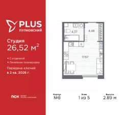 Объект забронирован клиентом!Продается 1-комн. квартира-студия с отделкой в ЖК ''PLUS Пулковский'' на 1 этаже. Общая площадь: 26.52 кв.м., площадь гостиной 17.67 кв.м., из которых 5 кв.м. выделено под кухонную зону. Все окна выходят на одну сторону. В квартире один совмещенный санузел. Высота потолков 2.89 м. Дом монолитный, трехподъездный, высотой 5 этажей. Квартира находится в 1-й секции в корпусе 8. На этаже 6 квартир. В подъезде 1 грузовой лифт. Окончание строительства - 2 квартал 2026 года. Оформление сделки по договору долевого участия. Уютный пятиэтажный city квартал PLUS Пулковский расположен в престижном Московском районе на пересечении Пулковского и Волхонского шоссе в новом формирующемся микрорайоне. Рядом проходит одна из важнейших транспортных артерий города Пулковское шоссе, а в 10 минутах езды два въезда на КАД и въезд на ЗСД. Благодаря удобному и быстрому выезду на Пулковское шоссе, можно легко добраться до центра города за 35 мин. До станций метро ''Московская'' и ''Купчино'' - 15 мин. на машине, а до аэропорта Пулково - 17 мин. В составе квартала: 30 пятиэтажных домов, школа со спортивным стадионом, 2 детских сада с бассейнами, наземные и подземные паркинги, центральный зеленый бульвар с play hub и местами отдыха. Благоустройство квартала продумано до мельчайших деталей, в его основе - забота о качестве жизни каждого жителя. Дома возводятся по современной монолитной технологии строительства с вентилируемыми фасадами. Благодаря большим увеличенным окнам и отсутствию высокоэтажных домов, во всех квартирах максимальный объем естественного света. В составе квартала запланированы социально-значимые объекты: школа на 825 мест со спортивным стадионом и бассейнами, два детских сада с бассейнами на 220 мест каждый. Территория квартала зонирована таким образом, чтобы автомобильные и пешеходные потоки и не пересекались. Прогулочные и велосипедные дорожки отделены от автомобильных проездов зелеными насаждениями. Дворы закрыты для машин, что дает чувство дополнительной безопасности для жителей особенно, для самых маленьких. Вся территория квартала безбарьерная. Здесь нет пандусов, резких перепадов высот или неудобных ступеней. Вход в парадные с уровня земли. В каждом дворе есть своя оборудованная детская площадка. А в центре микрорайона расположится большая игровая площадка play hub с пространством для командных игр. PLUS Пулковский располагается в молодом микрорайоне, который сейчас находится в стадии активного развития. Он будет обладать собственной развитой инфраструктурой. В радиусе 15 минут езды на автомобиле располагаются многочисленные магазины, супермаркеты, спортивные, образовательные и медицинские учреждения, парки и достопримечательности. Для автомашин предусмотрены отдельно стоящий 5-ти этажный паркинг на 958 машино-мест, две подземные парковки на 367 машино-мест и наземные парковочные зоны по внешнему периметру микрорайона. #2mBTSf
