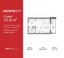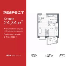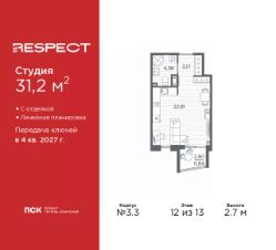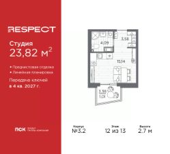 Просторная 1-комн. квартира-студия с отделкой в ЖК ''RESPECT'' на 12 этаже. Общая площадь: 27.67 кв.м., площадь гостиной 17.98 кв.м., из которых 5 кв.м. выделено под кухонную зону. Все окна выходят на одну сторону. В квартире один балкон, один совмещенный санузел. Высота потолков 2.7 м. Дом монолитный, многоподъездный, переменной этажности, от 8 до 13 этажей. Квартира находится в 1-й секции высотой 13 этажей в корпусе 3.3. На этаже 6 квартир. В подъезде 1 пассажирский и 1 грузовой лифт. Начало строительства - 3 квартал 2025 года. Окончание строительства - 4 квартал 2027 года. Оформление сделки по договору долевого участия. В шаговой доступности от жилого комплекса находятся станции метро (расстояние по прямой): ''Лесная'' (800 м), ''Площадь Мужества'' (1.4 км), ''Выборгская'' (1.9 км), также недалеко от этого корпуса расположены станции метро: ''Академическая'', ''Политехническая''. Квартал строится на Полюстровском пр, 87, в одной из самых востребованных локаций Петербурга. В 10 минутах пешком - метро ''Лесная'' и в 10 минутах на транспорте - Петроградская сторона. Высота домов от 7 до 13 этажей. На территории Respect строится школа на 1125 учащихся и детский сад на 240 мест. Запроектированы собственная газовая котельная, закрытая территория, дворы без машин и подземные паркинги с лифтами. Вентилируемые фасады облицованы клинкерным кирпичом. Дома из этого материала служат веками, являясь гордостью хозяев. Дизайн парадных зон и входных групп - сочетание лаконичности отделки и декоративных элементов с текстурами из натурального камня и дерева с приглушенной подсветкой теплым светом. Во входных группах расположены гостевые зоны с мягкой мебелью. Вся территория квартала будет связана единой концепцией благоустройства, разработанной ландшафтным бюро L.BURO. В основе - идея создания увлекательного ландшафтного пространства для насыщенной жизни, включающего в себя пейзажные зоны, современные архитектурные композиции, открытые террасы на стилобатах с зонами отдыха и парклетами, спортивными площадками. Это пространство для людей всех возрастов и различных увлечений. На эксплуатируемой кровле на уровне первого этажа в домах 1 и 4 будут обустроены общественные видовые террасы. В квартале запроектированы внутренние закрытые территории дворов домов без доступа автомобилей и безбарьерная среда для велосипедистов и колясок. Предусмотрены IP-домофония с функцией дистанционного открывания калиток и парадных, а также дистанционный сбор показаний счетчиков и мобильное приложение для жителей. Для безопасности жителей квартала - круглосуточное видеонаблюдение и служба охраны. В каждой квартире предусмотрены внешние корзины для кондиционеров. #Z6Bcwg